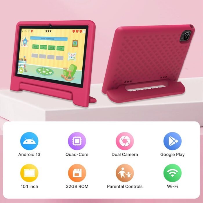 10.1″ Kids Tablet with Android 13, 1280×800 IPS HD Display, 32GB Storage, 5000mAh, Dual Camera, Parental Controls, WiFi & Bluetooth, Gift for Kids (Pink)