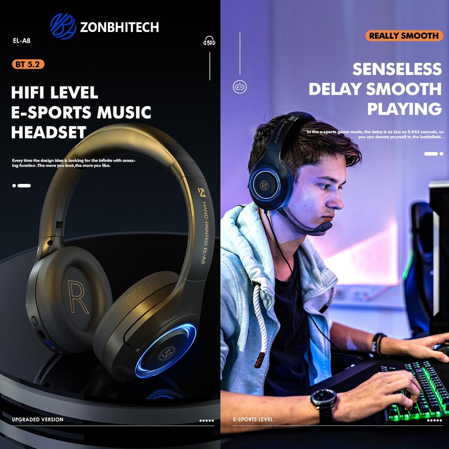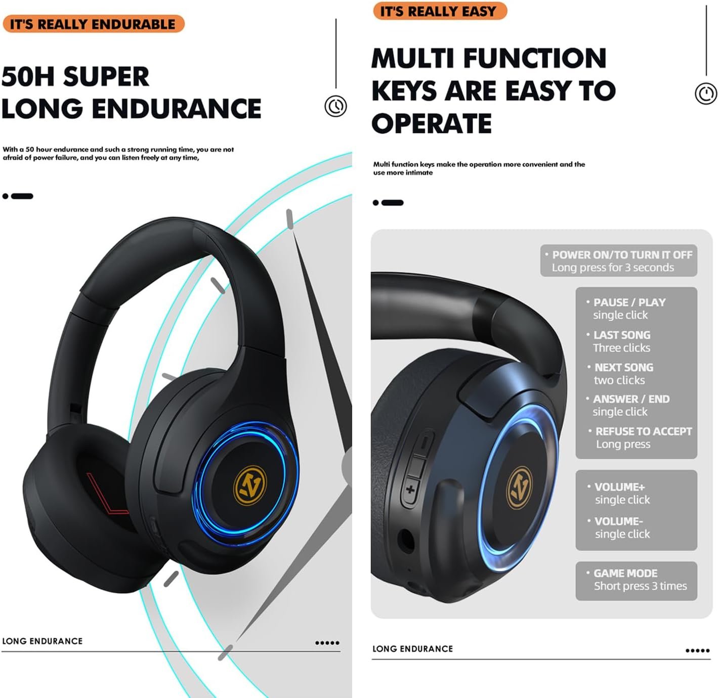 EL-A8 Seamless Bluetooth connection: Switch freely,press and hold the switch for 2 seconds and the headphones will be in ready to pair mode. The Wireless Headphones are compatible with all Bluetooth or 3.5mm plug cable-enabled devices! You can also receive calls and have hands-free communication through the detachable microphone. (Press the power button twice to turn on the LED light)