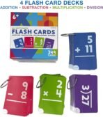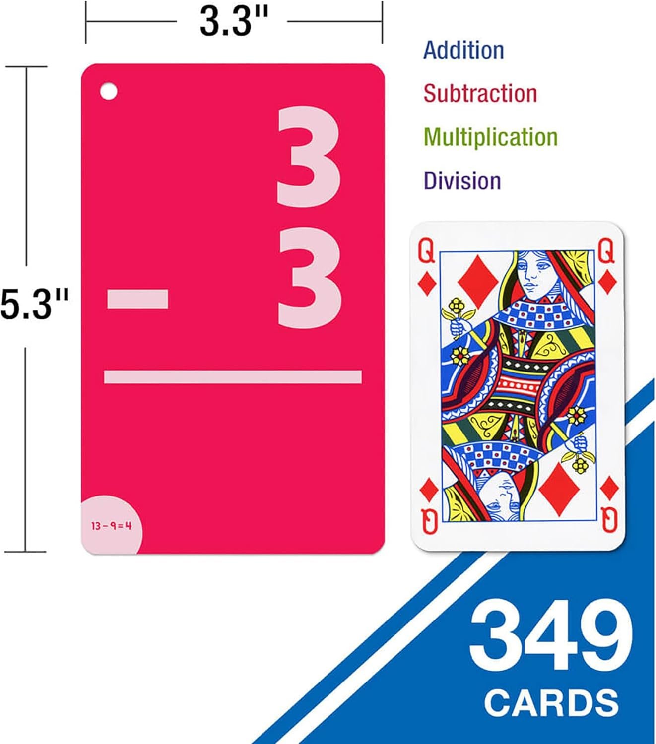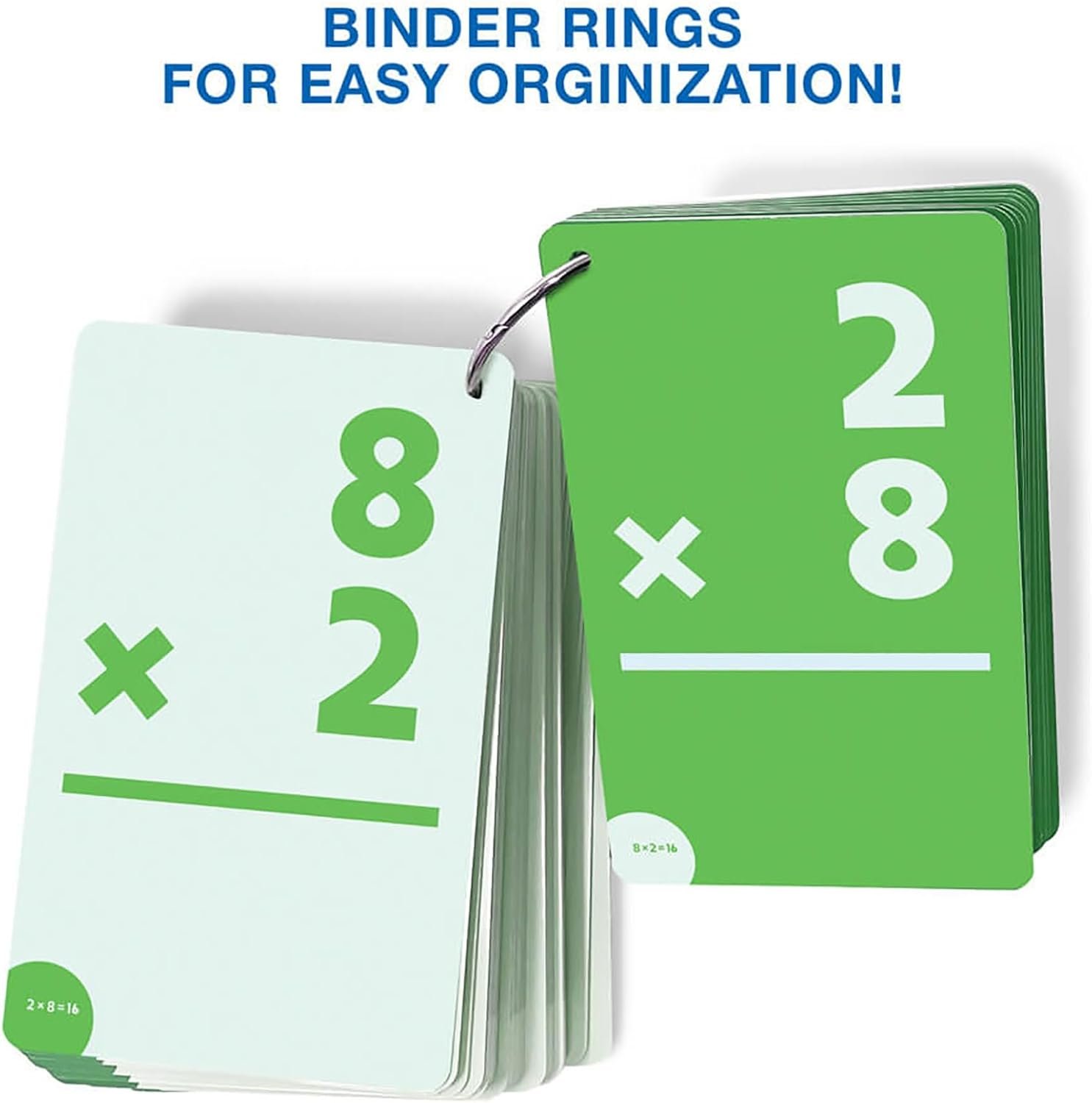 Turn math lessons into fun, math games that bring addition, subtraction, multiplication, and division to life with the Carson Dellosa All Facts Math Flash Cards! The kids flash cards set includes 4 packs of pre-punched addition flash cards, subtraction flash cards, multiplication flash cards, and division flash cards (148 flash cards), as well as a bonus resource card, 4 dividers, and 4 binder rings. Kids use the math manipulatives to practice all the basic facts for addition, subtraction, multiplication, and division while self-checking their answers. Students can also use the bonus resource card for additional math games. On the go? Attach the math flash cards to the included binder rings to practice math skills from just about anywhere!