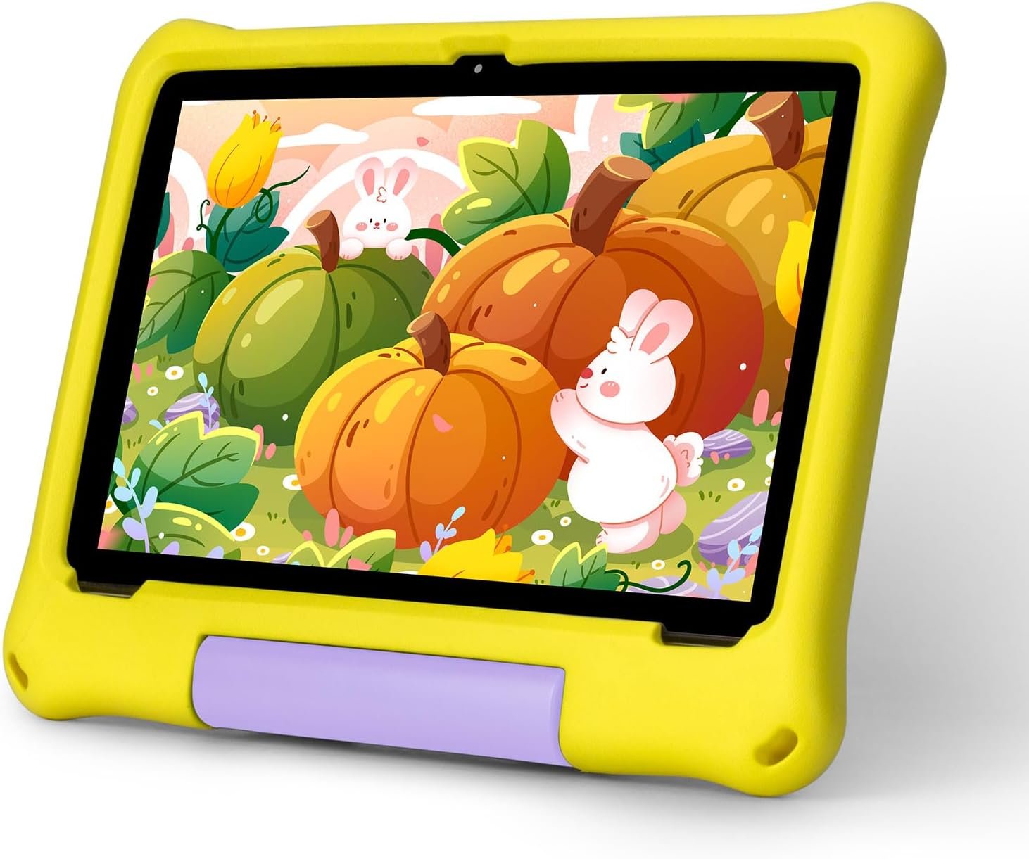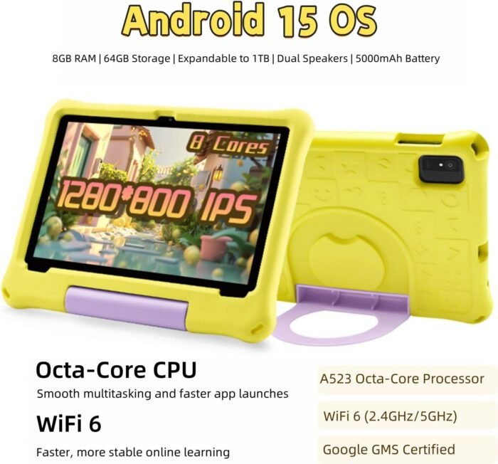Android 15 Tablets – Kids Tablet 10 Inch with Case, Octa-Core, 8GB+64GB Storage (Expandable to 1TB), Dual Camera, GMS Certified, 5G WiFi 6, Bluetooth – Tablet for Kids Ages 3–12 (Yellow)