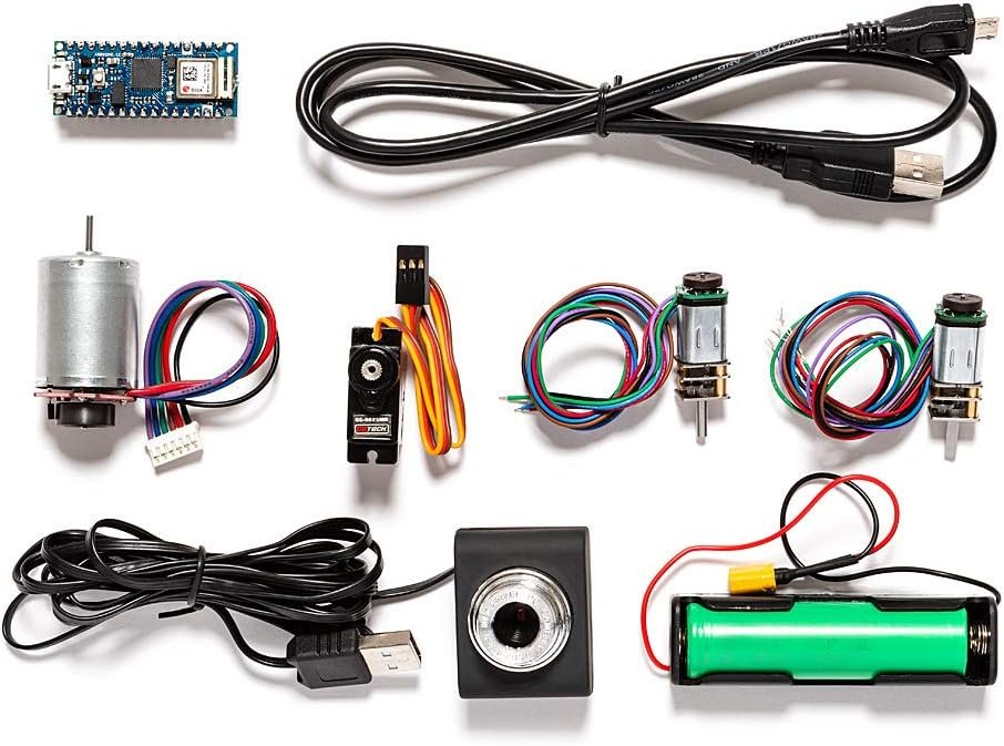 Hardware components include: one Arduino Nano 33 IoT that features WiFi connectivity, one Nano Motor Carrier that allows easy control for servos, DC motors, and stepper motors. You also get 1 DC Motor (12V) with Encoders, 1 Standard Micro Servo, 1 Micro Geared DC Motor (12V) with Encoders, 1 USB webcam, several mechanical parts including shafts and pulleys, wheels, nuts & bolts, and 1 LI-ION 18650 Battery with a holder.
