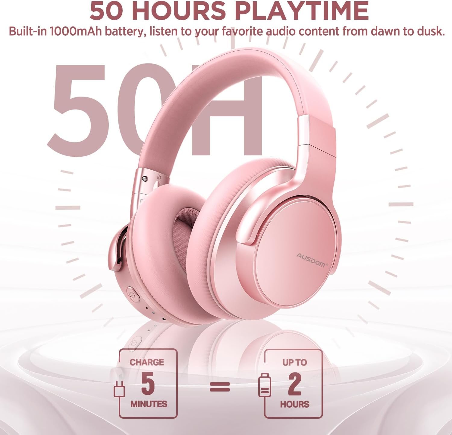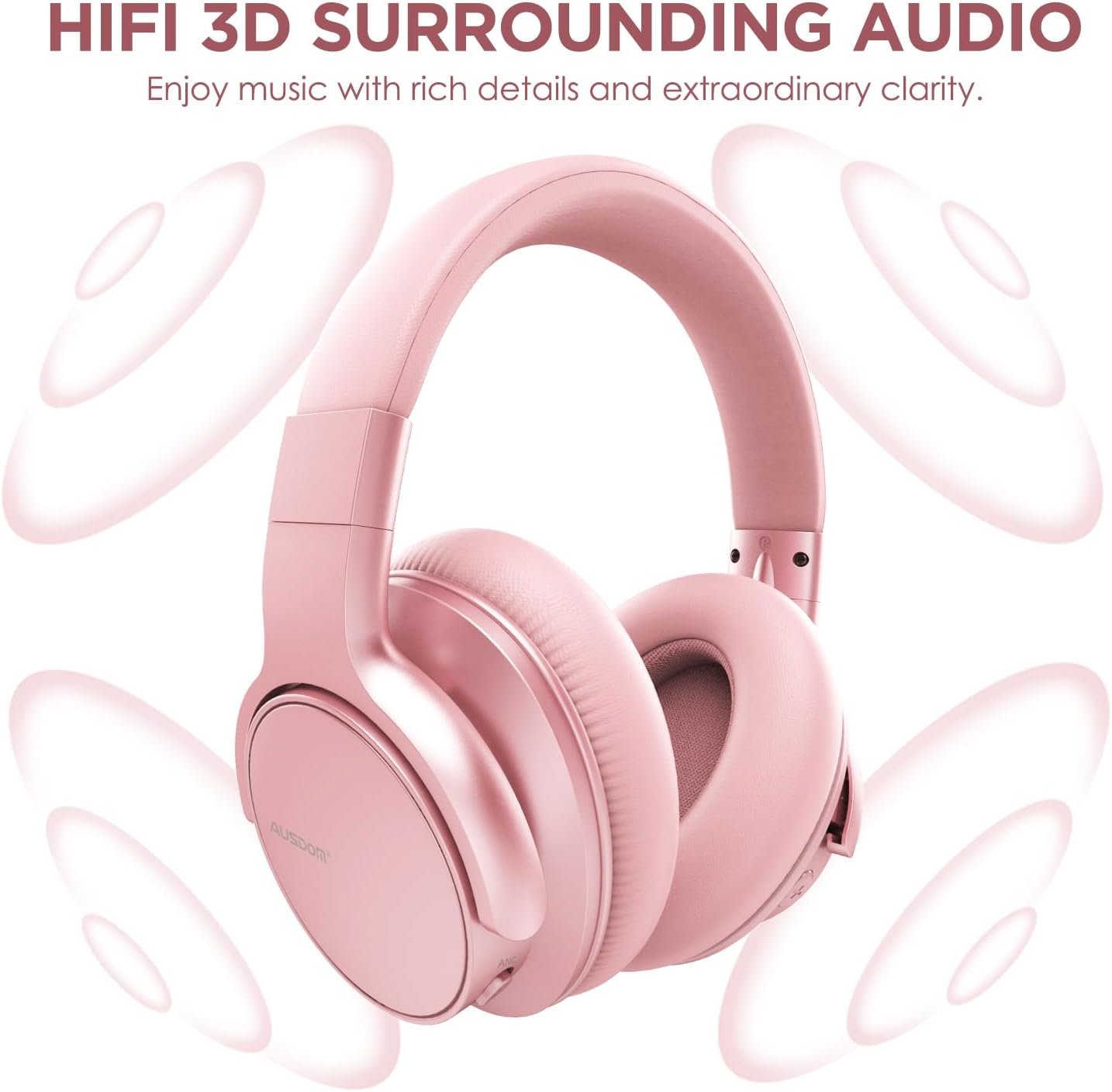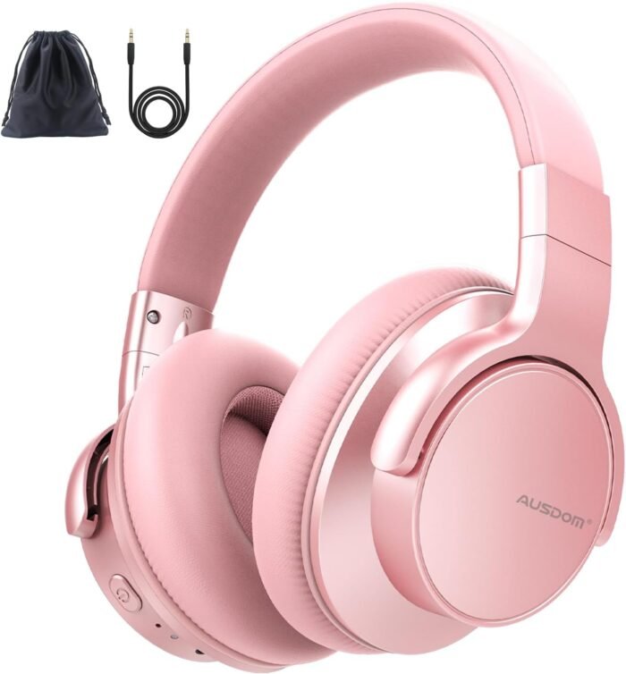 AUSDOM E7 Bluetooth Active Noise Cancelling Headphones, Wireless Over Ear ANC with Microphone, Hi-Fi Stereo Sound, 50H Playtime, Comfortable Earpads for Travel Work TV Phones, Rose Gold