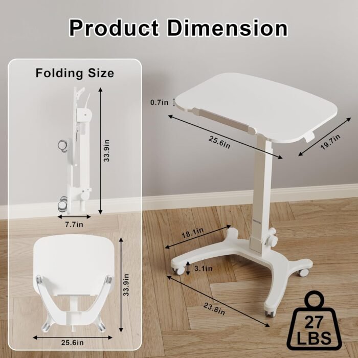 BONTEC Mobile Foldable Standing Desk, Portable Adjustable Height Desk with Gas Spring, Small Rolling Laptop Desk with Wheels for Home, Office, Bedroom, and Medical Use, 25.6″ x 19.7″ Desktop