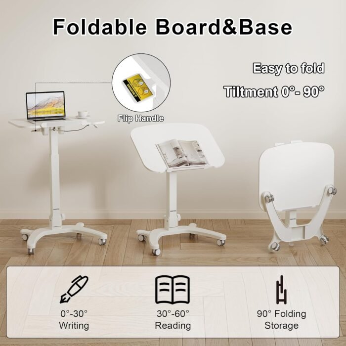 This rolling standing desk stands out with its tilt feature, allowing you to set the angle for different needs—keep it flat for working, tilt for reading, or fold up for easy storage. It’s a versatile, space-saving solution perfect for any home office or living space.