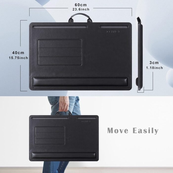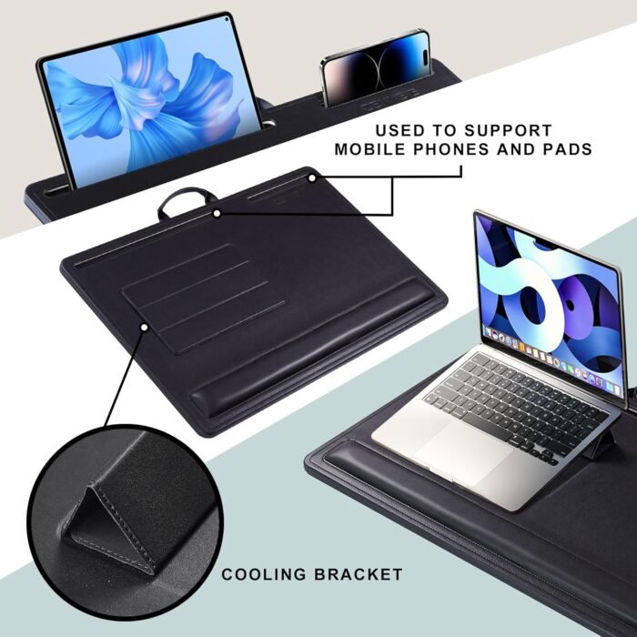 1.Large Leather Lap Laptop Desk : The Laptop Desk is 23.6 x 15.7 inches in size and can accommodate ultra large laptops. At the same time, The size of the computer and phone slots is wideïĵYou can easily put your With casing phone, Tablet into the slot provided.