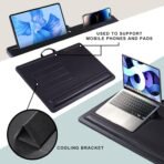 Multifunctional: Lap computer desk with adjustable laptop stand, Folds into a tiltable stand for cooling and better screen tilting angle when in use, spread out the stand to restore flat tabletop after use. Lap desk comes with an extended wrist rest that prevents computer sliding and offers wrist support. Lap desk can hold a laptop, mouse, cell phone, tablet at the same time, and its flat bottom can also be placed on glass tables, dining tables, coffee tables, writing desk and other.