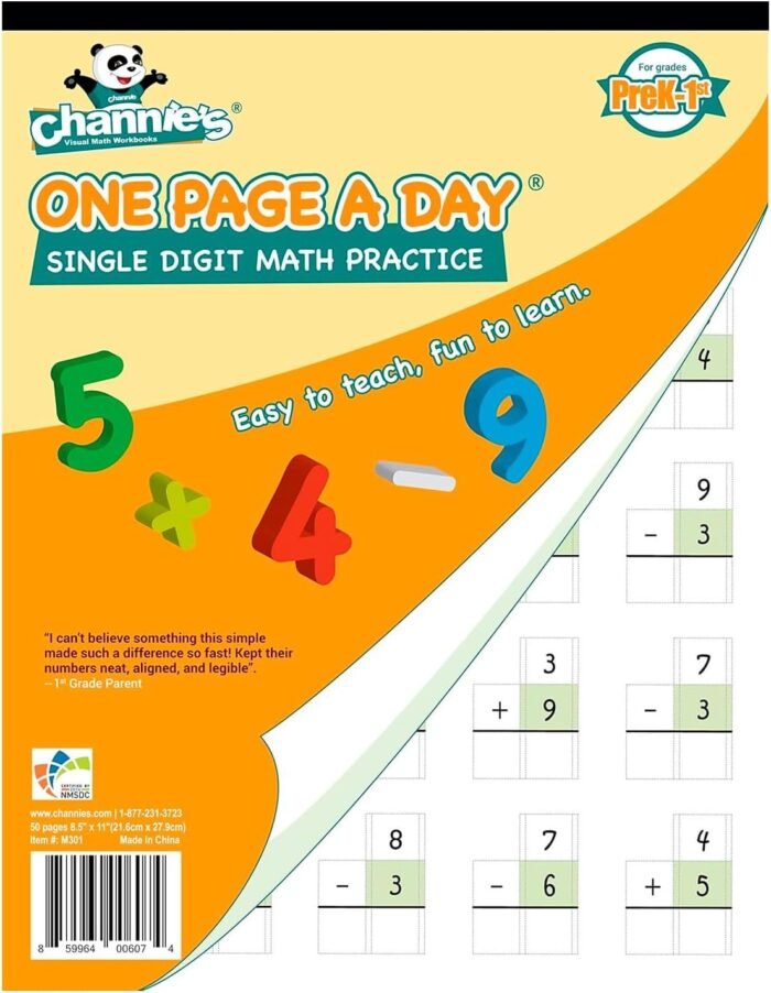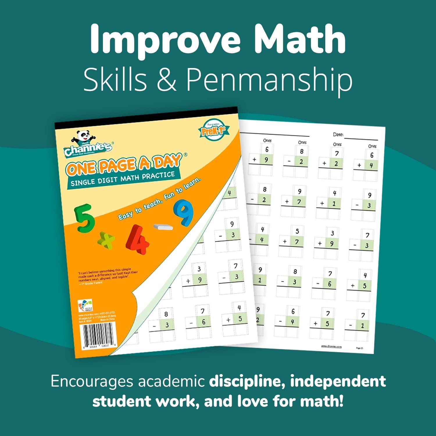 Channie’s One Page A Day Single Digit Addition & Subtraction Workbook for Pre-Kindergarten – 1st Grade Elementary School Students, Single Digit Math Practice, 50 Pages