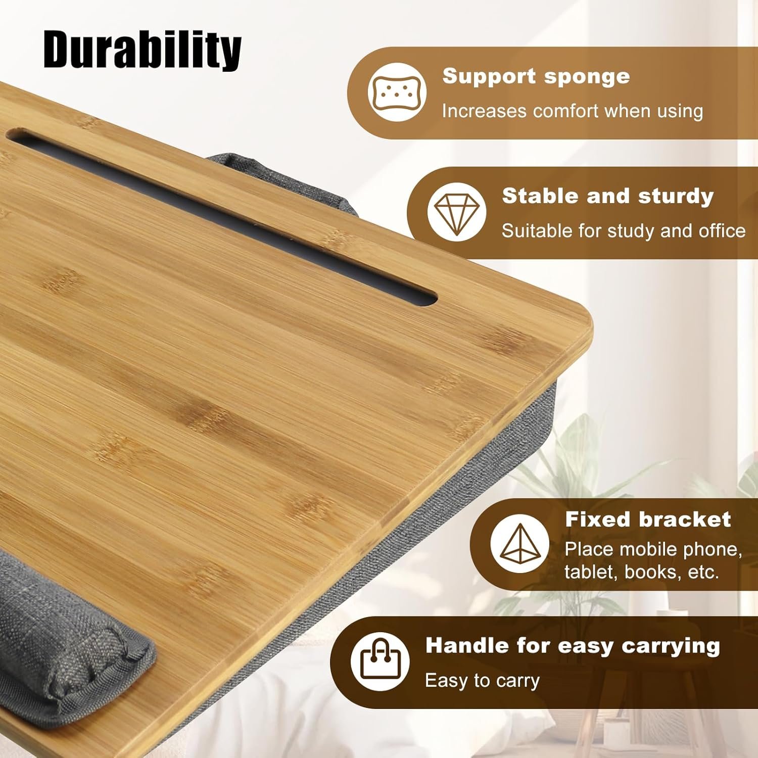 PORTABLE & ECO-FRIENDLY:Crafted from durable bamboo, this lap desk is not only sturdy but also environmentally friendly. Its lightweight construction and carry handle ensure portability for use at home, in the office, or while traveling, providing a natural and practical workspace solution