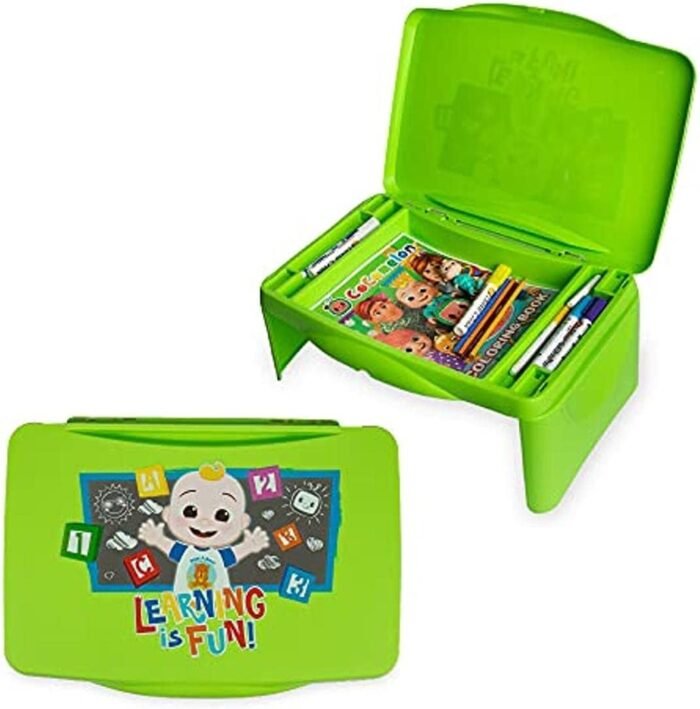 This Cocomelon collapsible folding lap desk makes work and activities fun and easy for kids. It easily folds away flat making it perfect for kids on the go and quick storage. Open and click the legs into position to provide a lap desk and large work area Ideal for doing homework, reading a book or a fun drawing/art activity. When the kids are done, The desk opens upward to a large storage compartment that can be used to store away books, pencils and other work material.