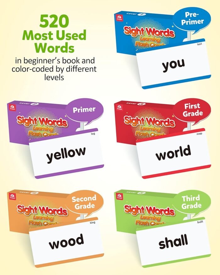 Color-Coded& Leveled: Comprehensive set of Sight words broken down by grade comes in various stages, so you can use them to build up your kid’s vocabulary. The decks are progressively more challenging with different colors. With bright colors and readable font, the Sight words are printed large on one side and small in the corner of the backside.