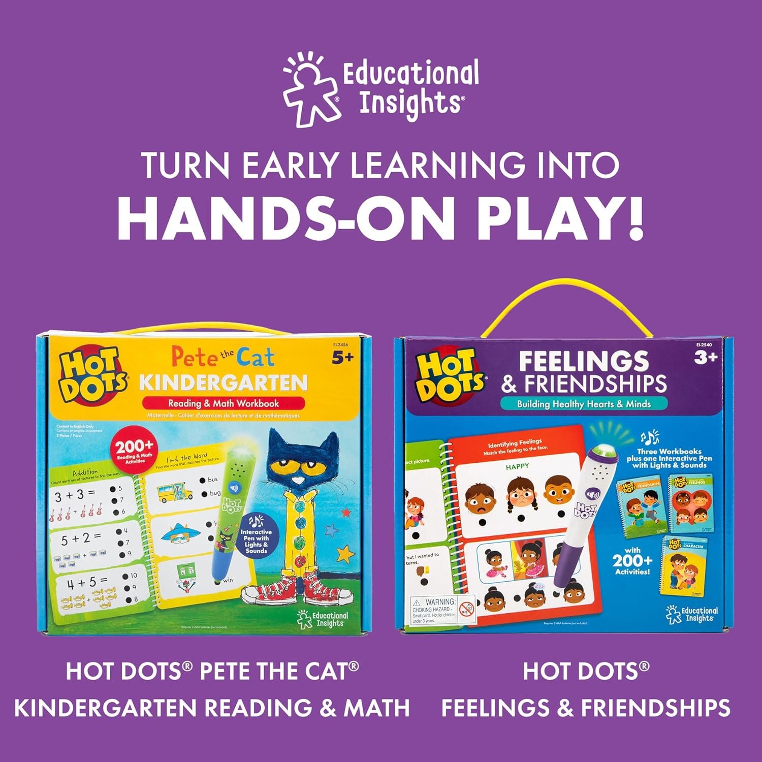 Prepare for kindergarten with a 2-in-1 interactive workbook that covers all the essential skills kids need for school. From 123s to ABCs and beyond, kids can build reading fluency and math skills with hands-on, self-paced activities. Press the Hot Dots pen to an answer dot to get instant feedback with lights and sounds, so kids can self-correct and build learning confidence. Pen does not talk or provide answers. Activity set includes activity book with 50 double-sided pages of activities and interactive Hot Dots pen. Pen requires 2 AAA batteries (not included).