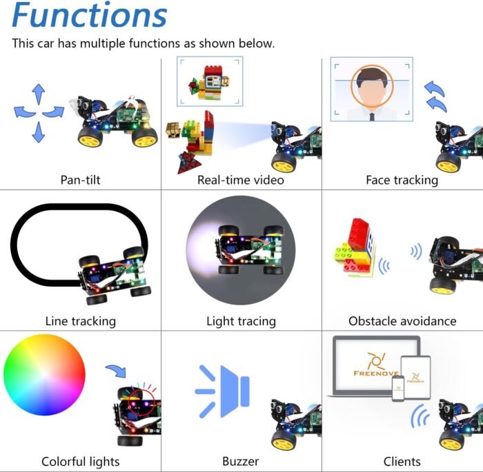 Be the first to review “Freenove 4WD Smart Car Kit for Raspberry Pi 5 4 B 3 B+ Zero 2 W, Face Tracking, Line Tracking, Light Tracing, Obstacle Avoidance, App Control, Camera, Servo (Raspberry Pi NOT Included)”