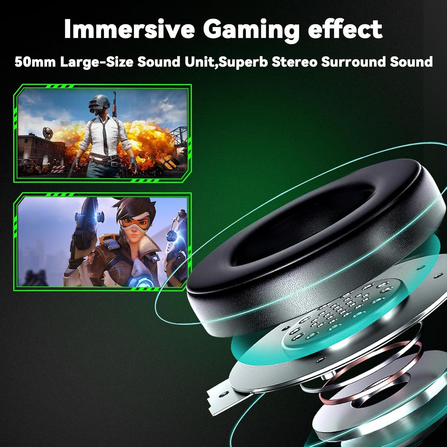 【Exceptional Gaming Headsets】50mm high-density neodymium audio drivers with stereo surround sound and deep bass. The immersive audio provides you with a distinct gameplay advantage, and the fantastic movie viewing experience for movies sound.