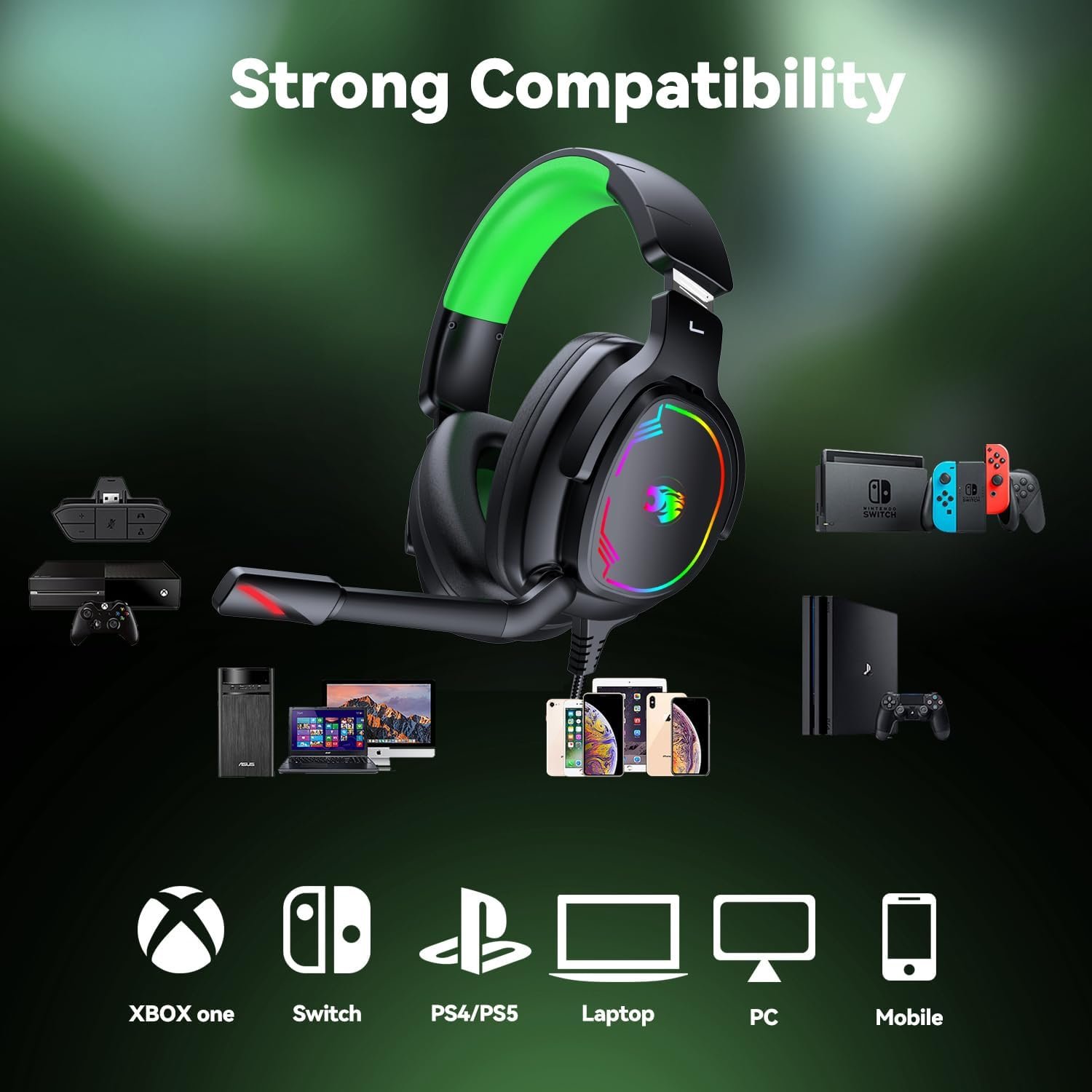 Gaming Headset for PC/PS4/PS5/Xbox One/Switch, Stereo Surround Sound Gaming Headphones with Noise Canceling Flexible Mic, Computer Headset with 3.5mm Jack & RGB Light(Green)