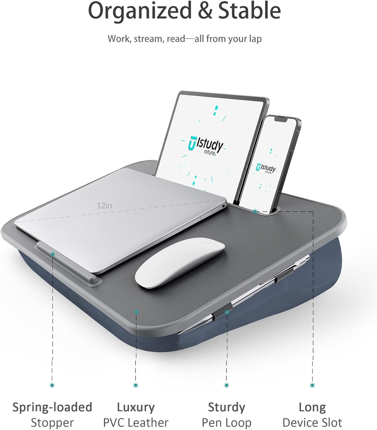 4. [Stay Organized Design]: The laptop lap pad comes with a practical design that keeps your desk organized. The spring-loaded stopper keeps your devices from slipping, the Long Device slot for tablet and Phone, the pen holder under the desktop, and the Textured PVC leather surface keep things in place.