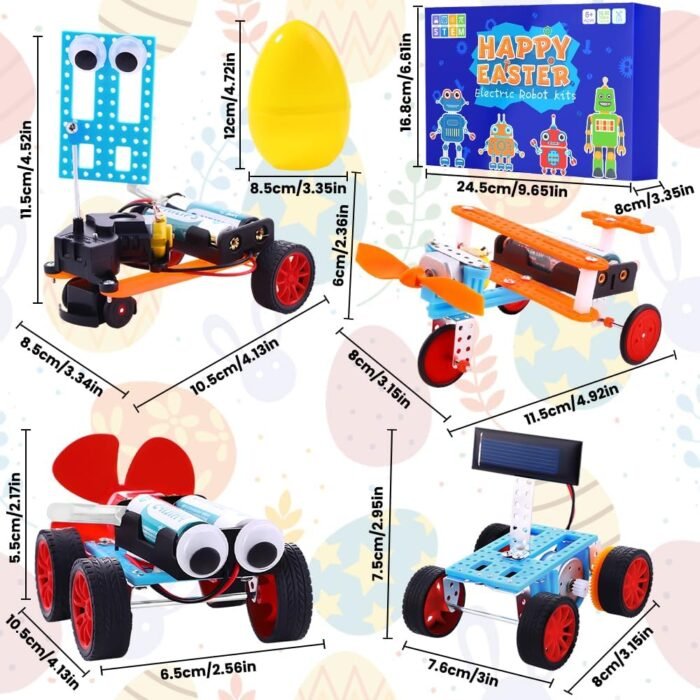 Great Value Robot Kit:Easter eggs filled with STEM kits for kids includes solar powered car, obstacle avoidance robot, gliding airplane, wind powered car kit and four easter eggs (12*8 inches, orange, blue, pink, yellow), requires (not included) AA batteries. Each robot kit comes pre-assembled in an Easter egg, kids will be amazed when they open the pre-assembled Easter eggs