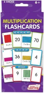 Contains 162 flash cards for teaching multiplication and division including 2, 3, 4, 5, 10 times, then 6, 7, 8, 9 times. Division for 2 – 10. Ages 6+.