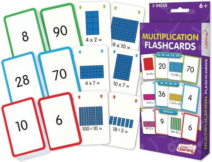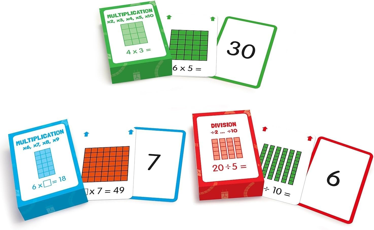 Contains 162 flash cards for teaching multiplication and division including 2, 3, 4, 5, 10 times, then 6, 7, 8, 9 times. Division for 2 – 10. Ages 6+.