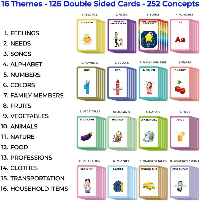 Iclude 120 double sided flash cards 240 pcs covering 16 subjects such as the alphabet, numbers, feelings, needs, colors, food, professions, items, fruits, family, animals, transportation, nature, vegetables, clothes and songs.Children’s favorite songs inside, such as “ABC Song”, “If You Are Happy And You Know It” and the others. It’s the ONLY flash cards product on the market with songs.Rechargeble and portable. Can be used as pocket speech talking flash cards device.