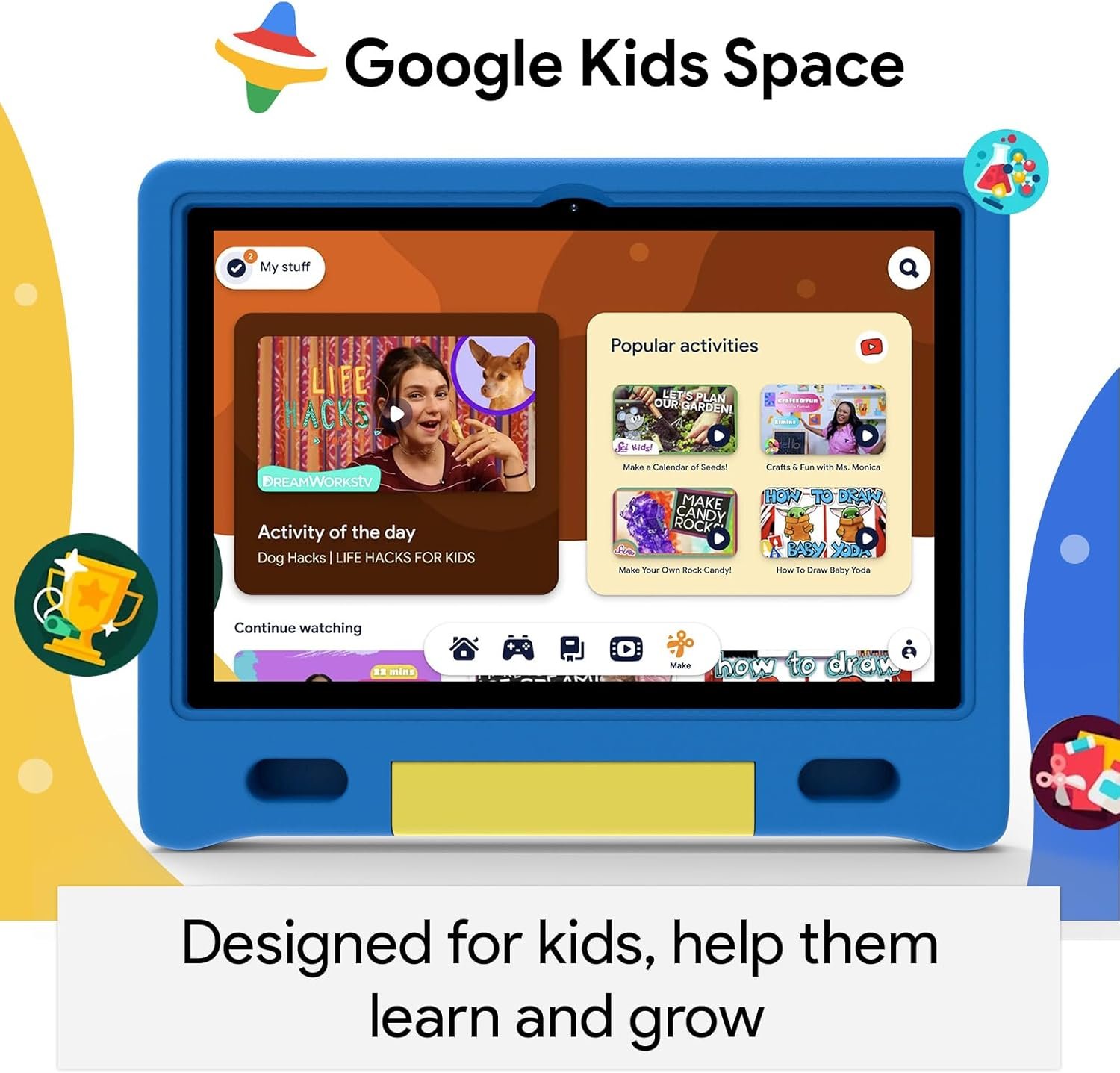 Space + Parental Controls: The K109A 10.1-inch Kids Tablet comes with pre-installed Google Kids Space. It offers a wide array of educational content, apps, and games designed specifically for children. The tablet has customizable parental controls, allowing you to set screen time limits, choose appropriate content, and monitor browsing. This ensures a safe and secure digital environment for kids.