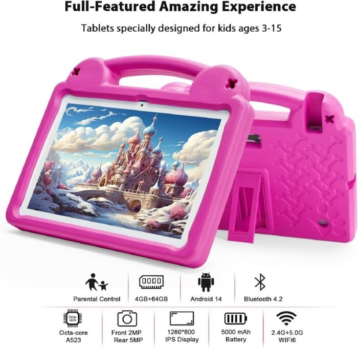 [Powerful Android Tablet 10 Inch for Kids – 8GB RAM, Octa-Core & WiFi 6] This kids tablet features 4+4GB RAM, 64GB ROM, and supports up to 1TB microSD expansion (card not included). Powered by an A523 octa-core processor, it runs smoothly on Android 14. With dual-band WiFi 6 (2.4G + 5.0G), downloads and streaming are faster and more stable
