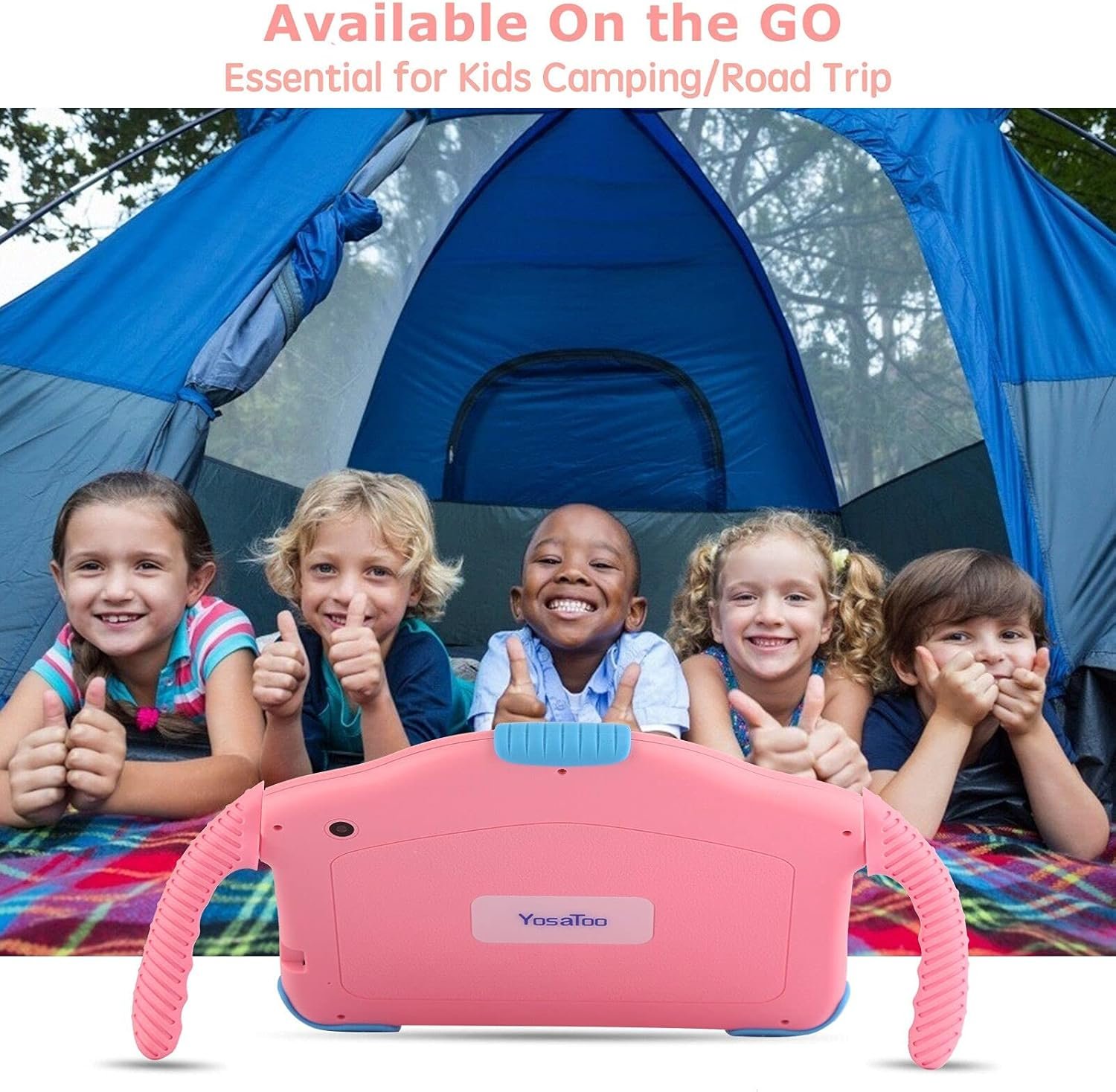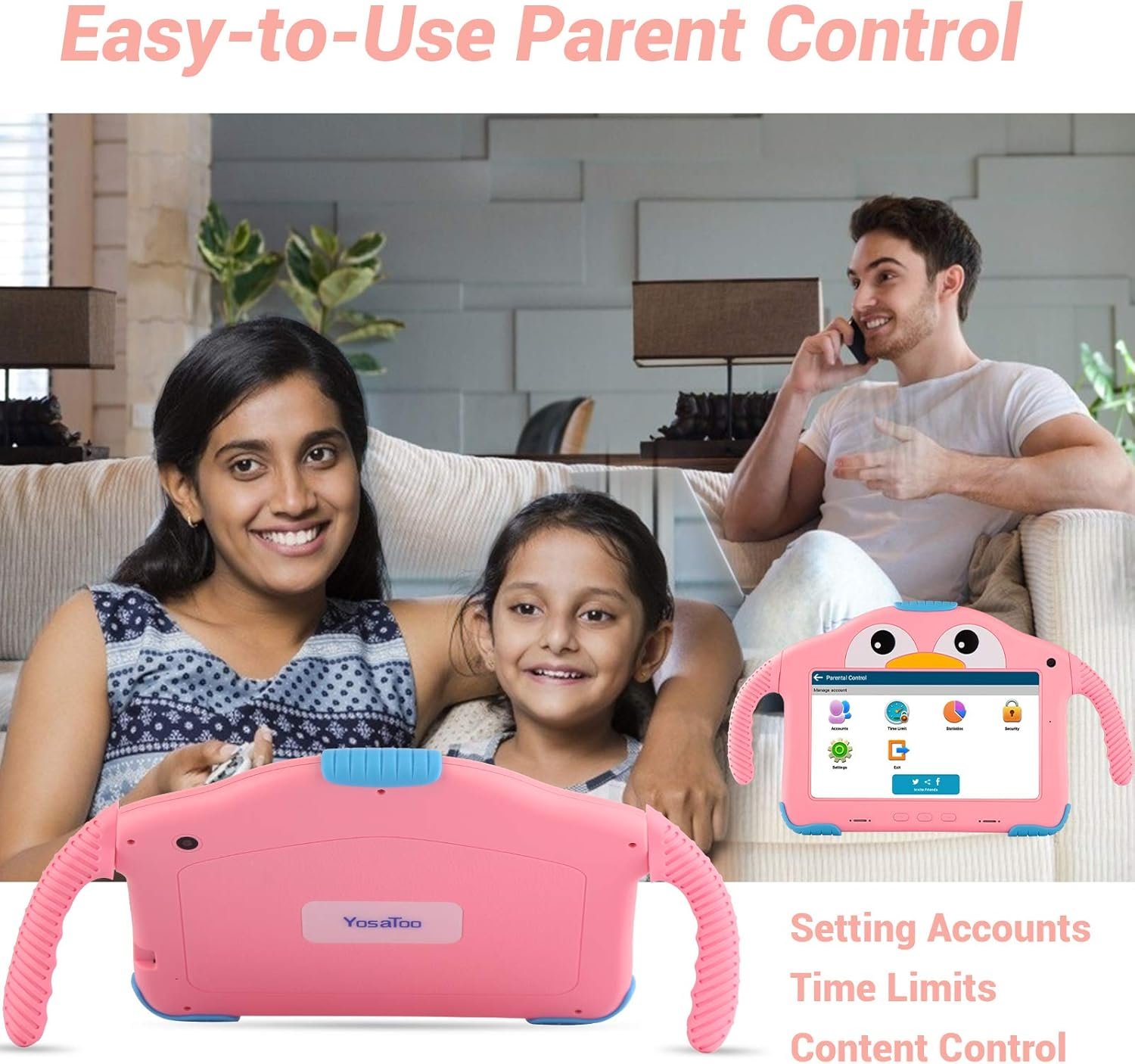 Safety Kids Protection Screen: Yosatoo kids tablets for kids adopts a 7 inch HD screen display. It can automatically adjust the brightness to a comfortable reading experience. Kid tablet comes with penguin handle case.The special design is not only protect screen against drops or bumps,but also well for kids hands free viewing or carrying everywhere