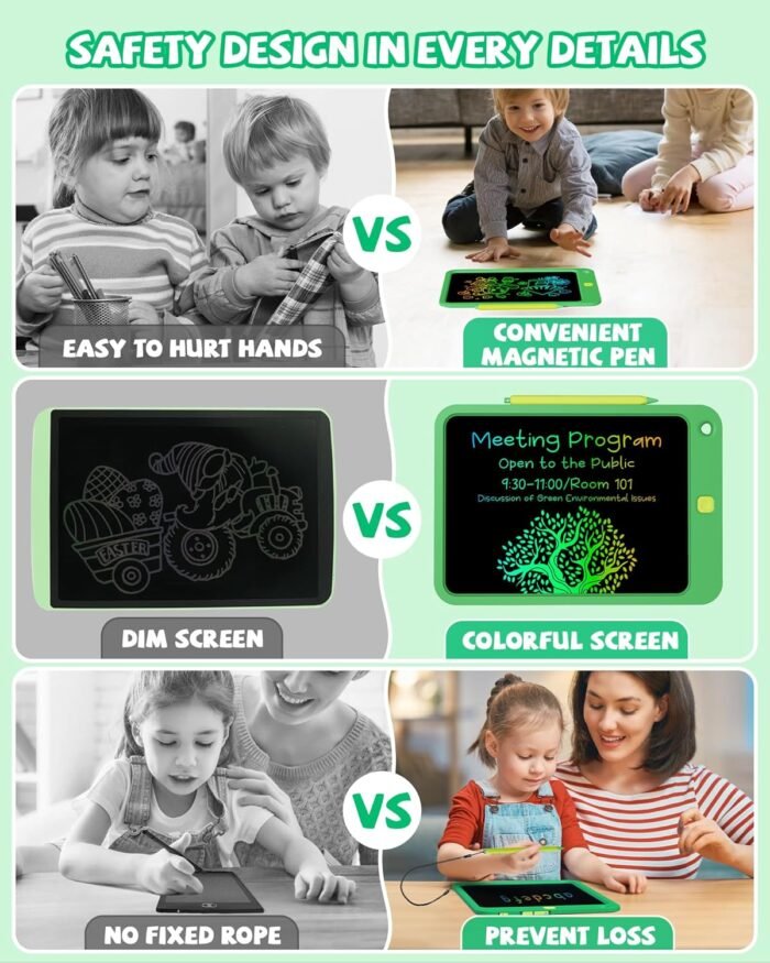 Eye Protection & Long Battery Life: This writing board for kids colorful screen features no glare, no blue light, which is effective to protect children’s eyes for a long time use. The writing tablet can be repeated using 100,000 times, avoid paper wasting. We added a screw to the battery lock of the doodle pad to prevent children from swallowing unknown parts