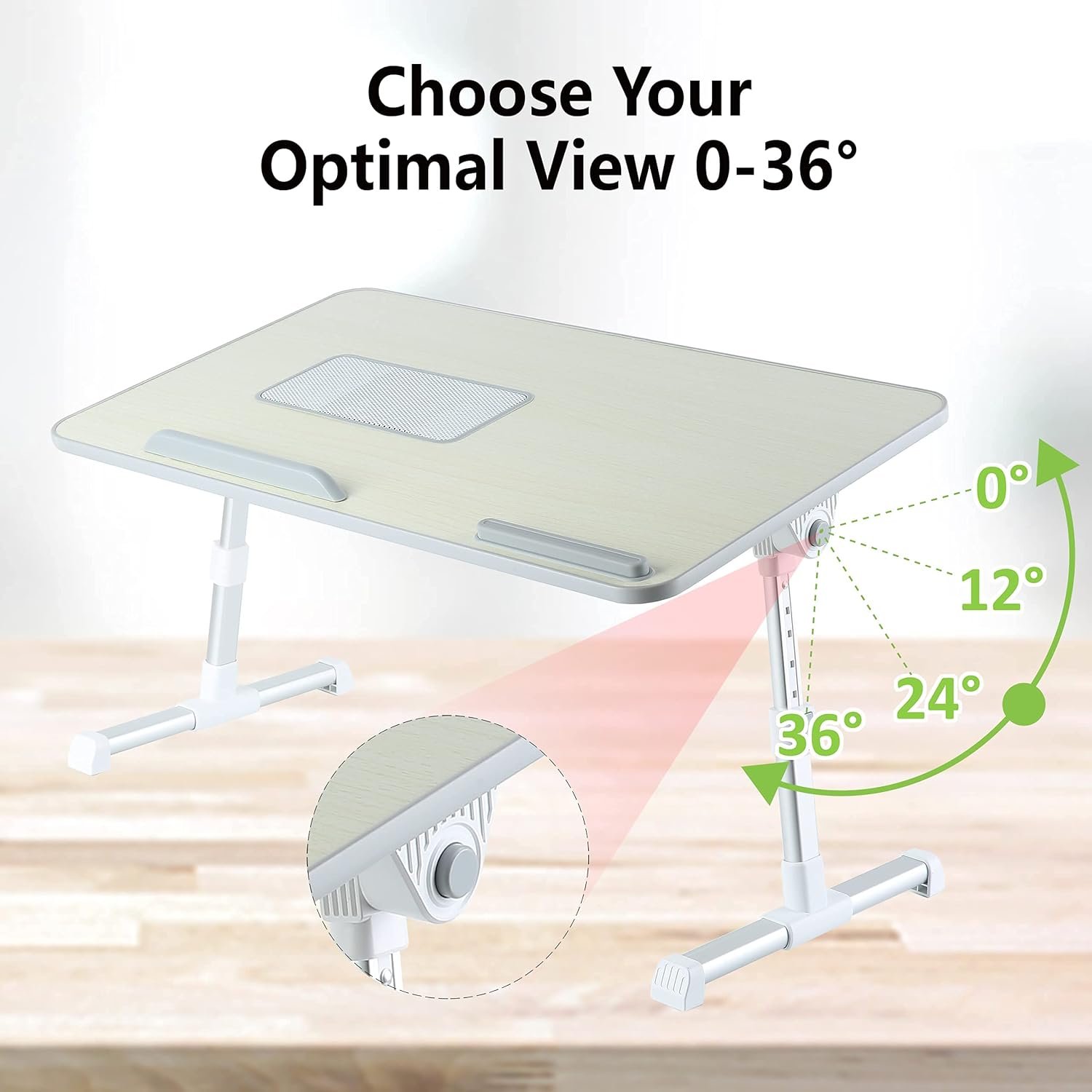 【Easy to Adjust】Fully assembled, Two auto-lock buttons on each side easily enable quick changes in height. 5 different heights can be set by its legs (adjustable from 9.4 – 12.6 inches), more ergonomic and convenient. With two circle buttons, they can be also used to adjust the surface level to 4 different angles (from 0-36°).
