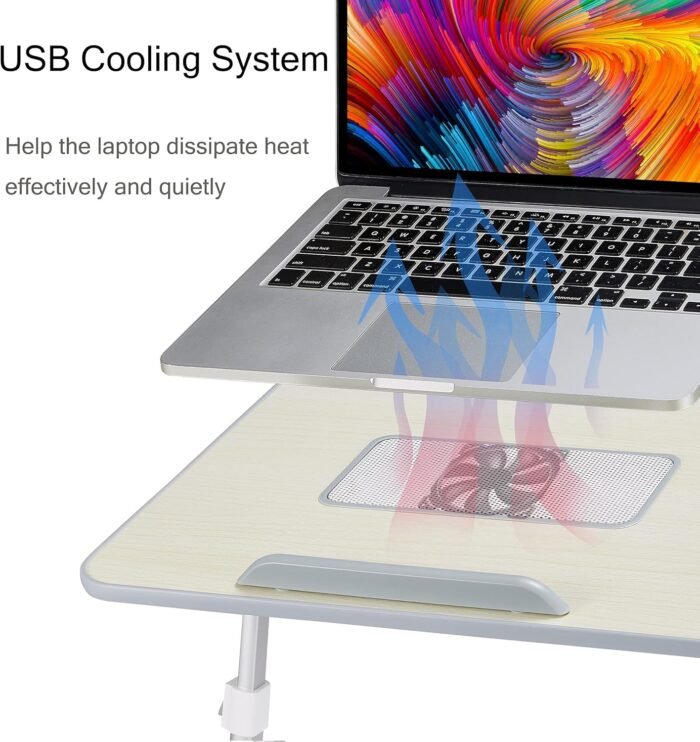 Cooling System : Build-in Cooling Fan is aim to help the laptop dissipate heat effectively and quietly.Multi-purpose : Suitable for Working, Writing, Gaming, Drawing, Eating, children’s studying and outdoor activities in your daily life.Adjustable Height and Angle: 5 different heights and 4 different angles for you to choose easily.Lightweight but Sturdy: Made of High Density Board and Max support 35lbs.Easy to storage: The folded size is 20.5″ x 11.8″ x 2″ or 23.6″ x 13.6″ x 2″, easy to storage under the bed and sofa.Ergonomic Design: Work as standing workstation on a regular desk can fix your posture all day sitting at a desk and be able to work in bed or sofa.