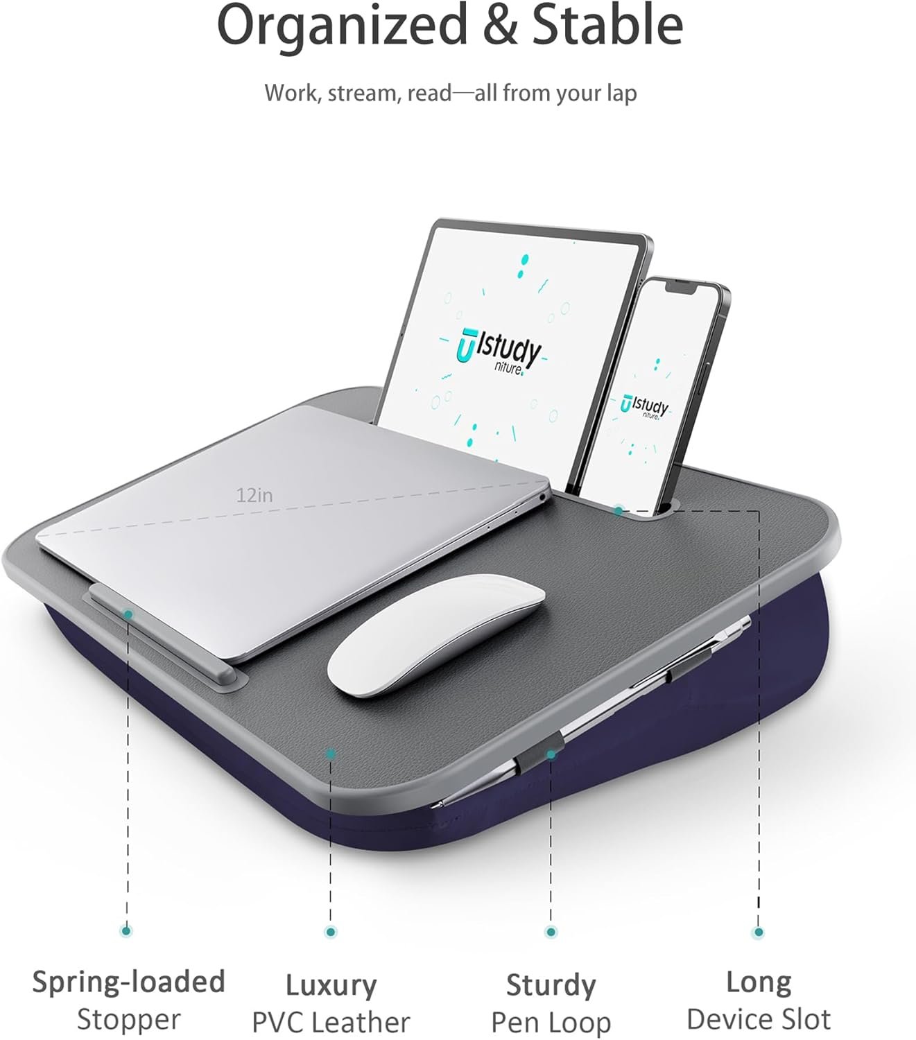 4. [Stay Organized Design]: The laptop lap pad comes with a practical design that keeps your desk organized. The spring-loaded stopper keeps your devices from slipping, the Long Device slot for tablet and Phone, the pen holder under the desktop, and the Textured PVC leather surface keep things in place