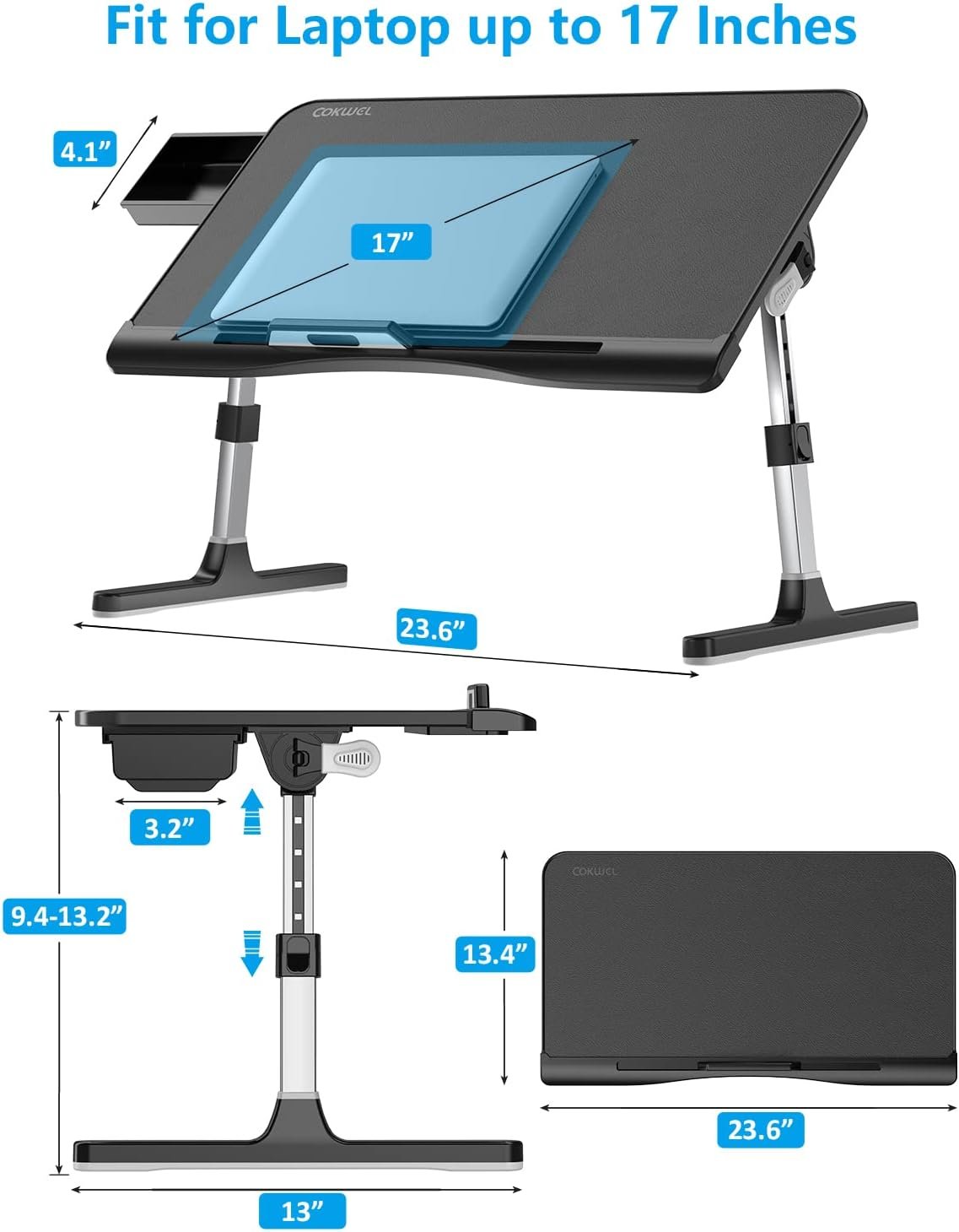 COKWEL laptop bed tray desk come with storage drawer, which helps to store pen, mouse, USB cables, tape, eyeglasses, laptop stopper and other small pieces in it. Two auto-lock buttons on each side can be easily adjusted the heights and angels, the legs enable 5 different heights. Giving you enough space and a comfortable sitting position on the couch or floor.
