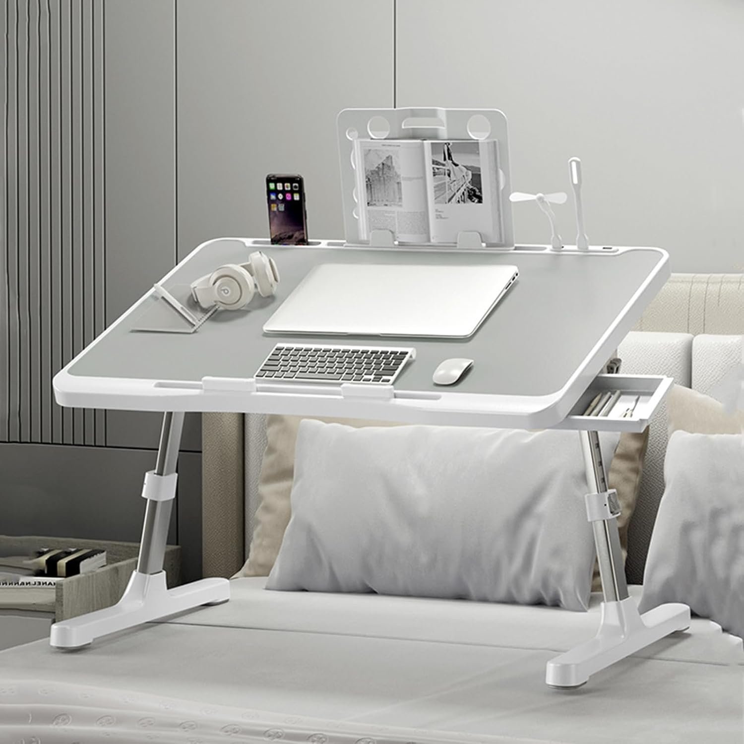 Laptop Desk for Bed, Adjustable Bed Table with USB Charge Port, Foldable Laptop Table with Storage Drawer, Portable Laptop Bed Desk Tray for Eating Working Writing Reading (Silver)