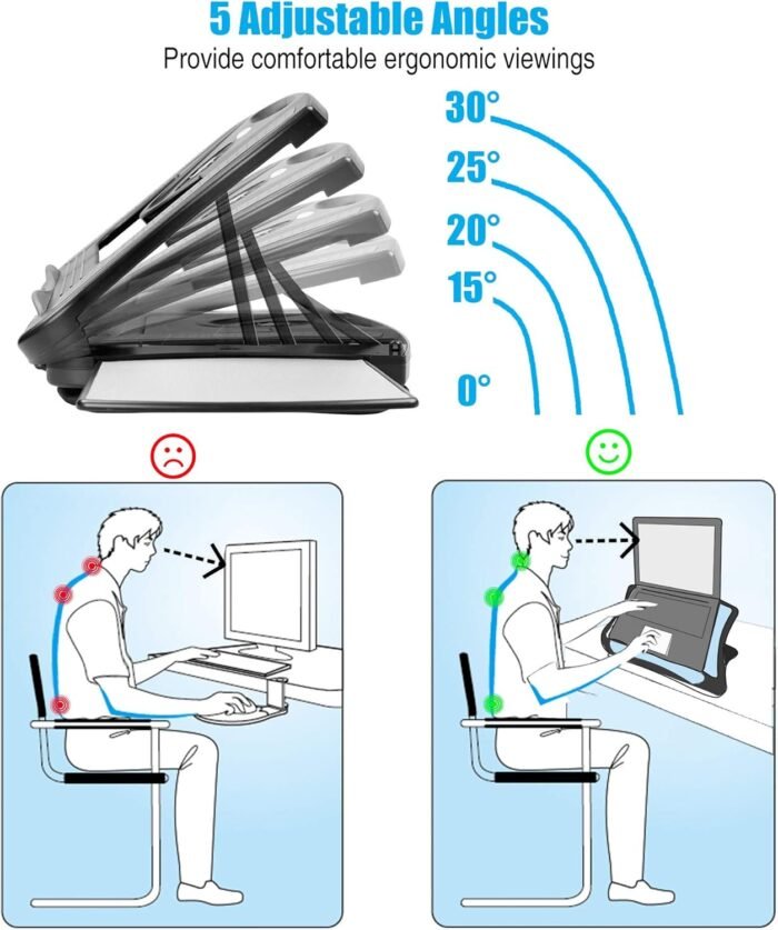 ERGONOMIC DESIGN – 5 different angle adjustments (0/15/20/25/30°) will effectively reduce your neck, shoulder and back tension. You can set up your laptop for the most comfortable viewing, studying and typing angles.
