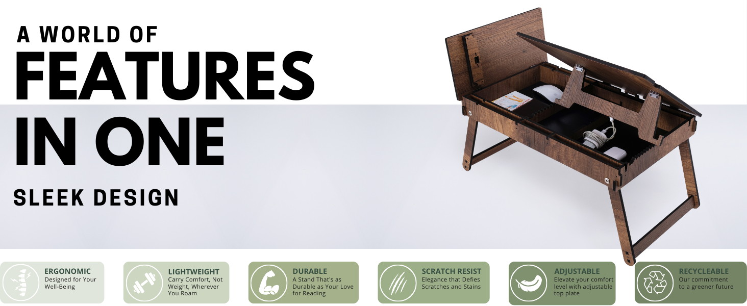 Where Convenience Meets Quality – Your All-in-One Stand. This book stand features a convenient storage compartment for keeping reading materials, pens, or other small items organized.