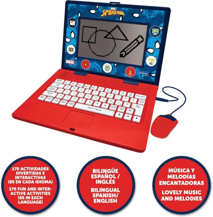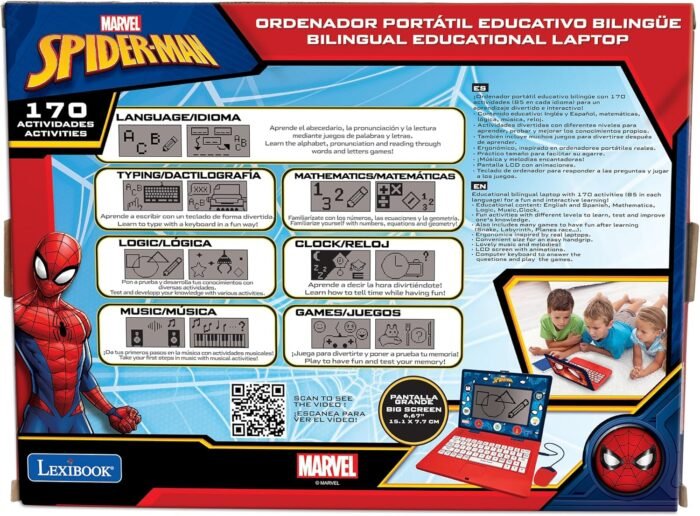 Discover the ultimate learning companion for your kids: our Spider-Man Educational Bilingual Laptop in English and Spanish! With its bright red and blue design, children can learn and have fun with Spider-Man. Designed to spark curiosity and foster knowledge, this laptop offers 170 engaging activities—85 in English and 85 in Spanish—covering a wide range of subjects from language arts to mathematics, general knowledge, logic, clock reading, and even music. Each activity is crafted to challenge and elevate your child’s learning experience, with varying levels to adapt as they grow. After a rewarding learning session, kids can unwind with a selection of entertaining games like Snake, Maze, and Plane Races. This educational laptop’s design is ergonomically inspired by real laptops, ensuring a comfortable and natural experience for little hands. Its convenient size and easy handgrip make it the perfect educational tool for on-the-go learning. With lovely music and melodies to delight their ears and a large 9.7″” LCD screen that bursts with animations, children will be visually and audibly engaged. Plus, the computer keyboard allows for interactive play and helps kids practice their typing skills. Powered by 2 x AA/LR6 batteries, forget about inconvenient cables and enjoy wireless entertainment. The Lexibook Spider-Man bilingual educational laptop isn’t just a toy; it’s a gateway to a world of learning and fun!