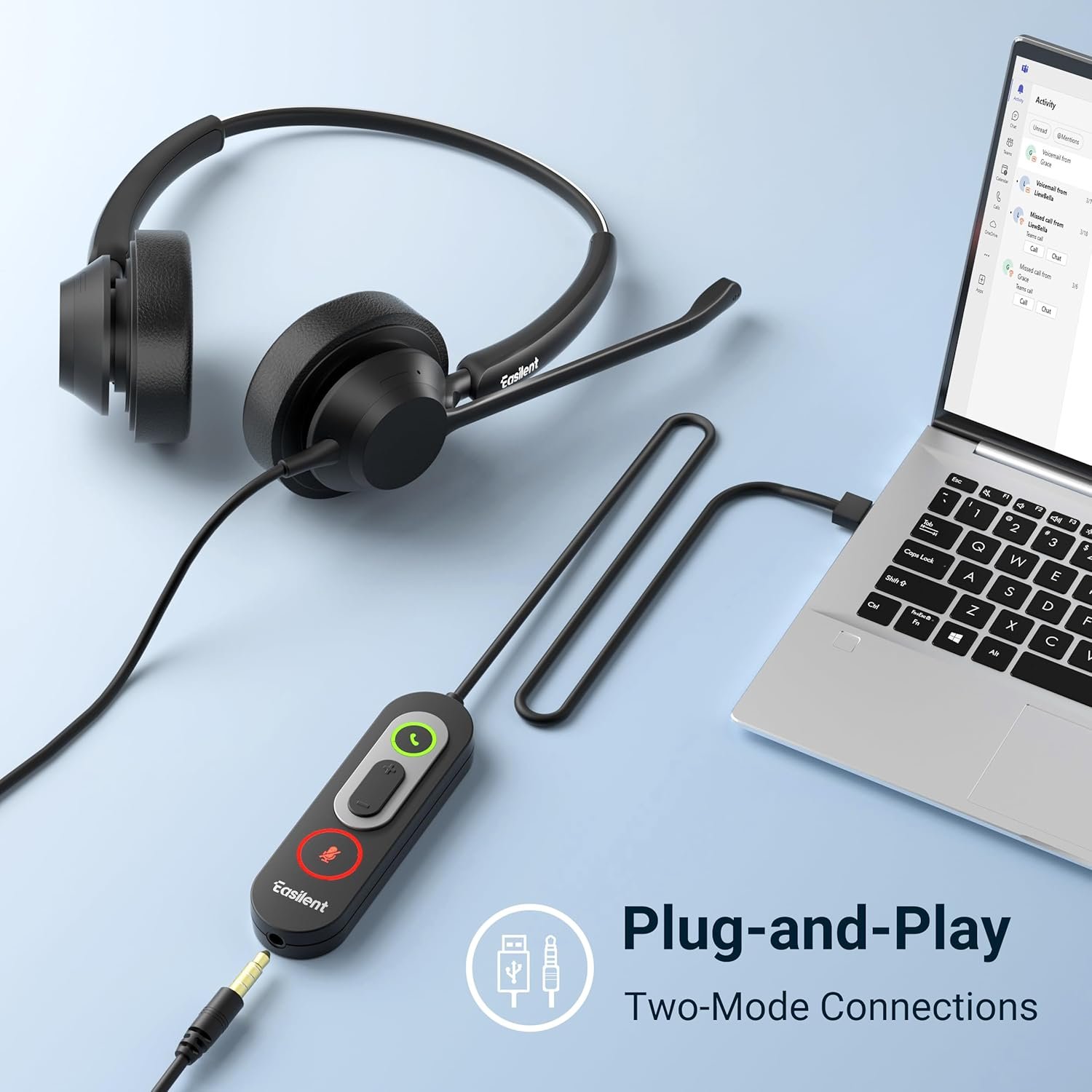 Plug & Play Versatility: Switch seamlessly between 3.5mm wired and USB connectivity with the detachable controller. Compatible with PCs, laptops, smartphones, and tablets, this business headset offers true plug-and-play functionality. The anti-mispress design prevents accidental button presses, making it ideal for busy call centers or home office setups.