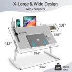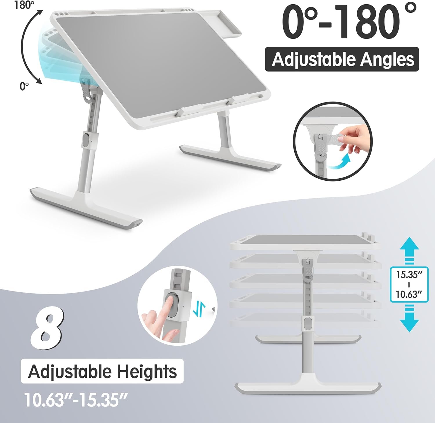 【Ergonomic Design Bed Desk】: Soft wrist rest pad provides your wrist a comfortable place. The retractable blocker protects your computer from falling down. 5 adjustable heights(9.4″-12.6″) and 4 adjustable angles (0-36°) provide you a more comfortable posture and avoid back & neck pain.