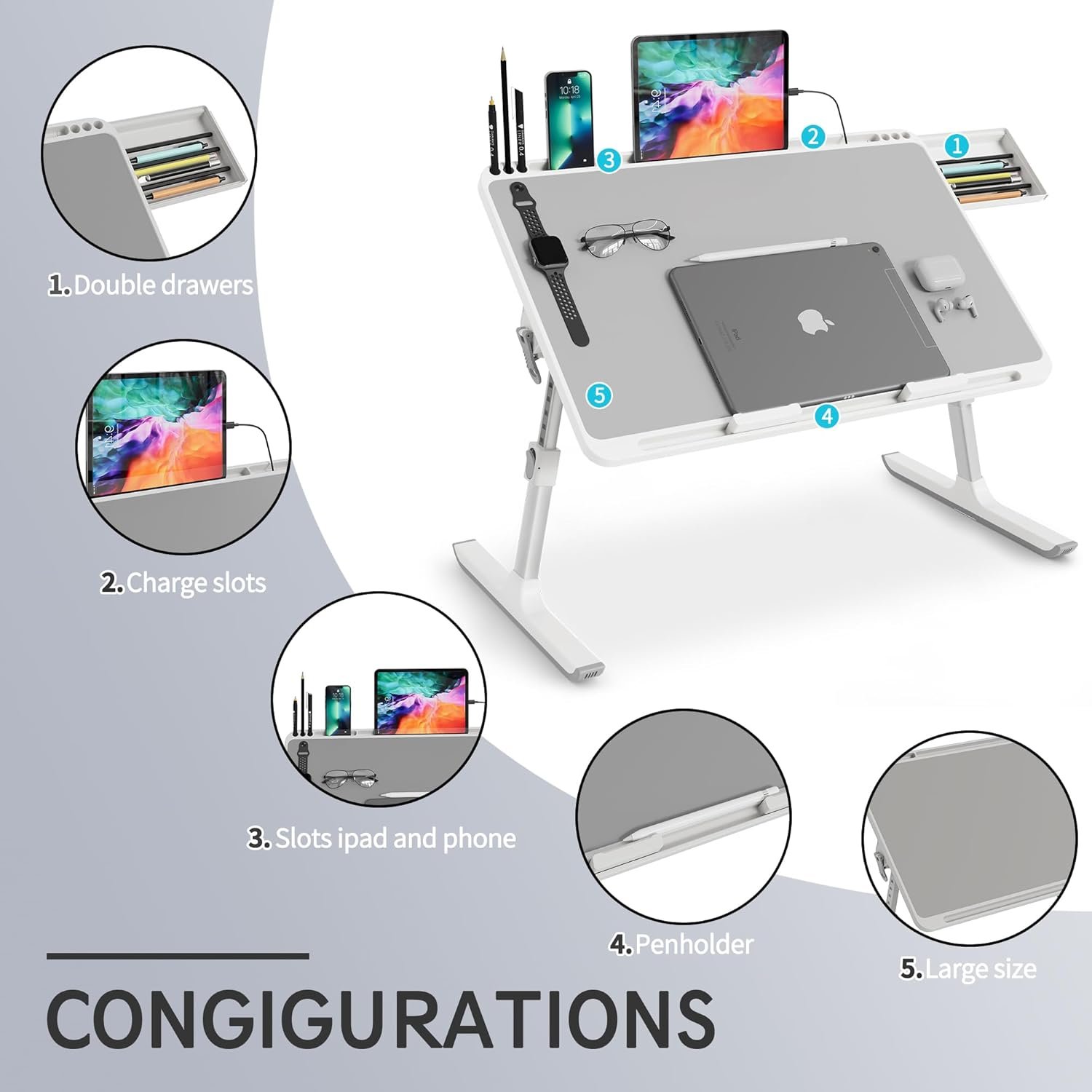 Monomi Laptop Desk for Bed, Height & Angle Adjustable Laptop Stand for Bed,Light Weight Foldable Portable Lap Desks Trays with Storage Drawers, Lap Table for Eating, Working, Writing and Drawing