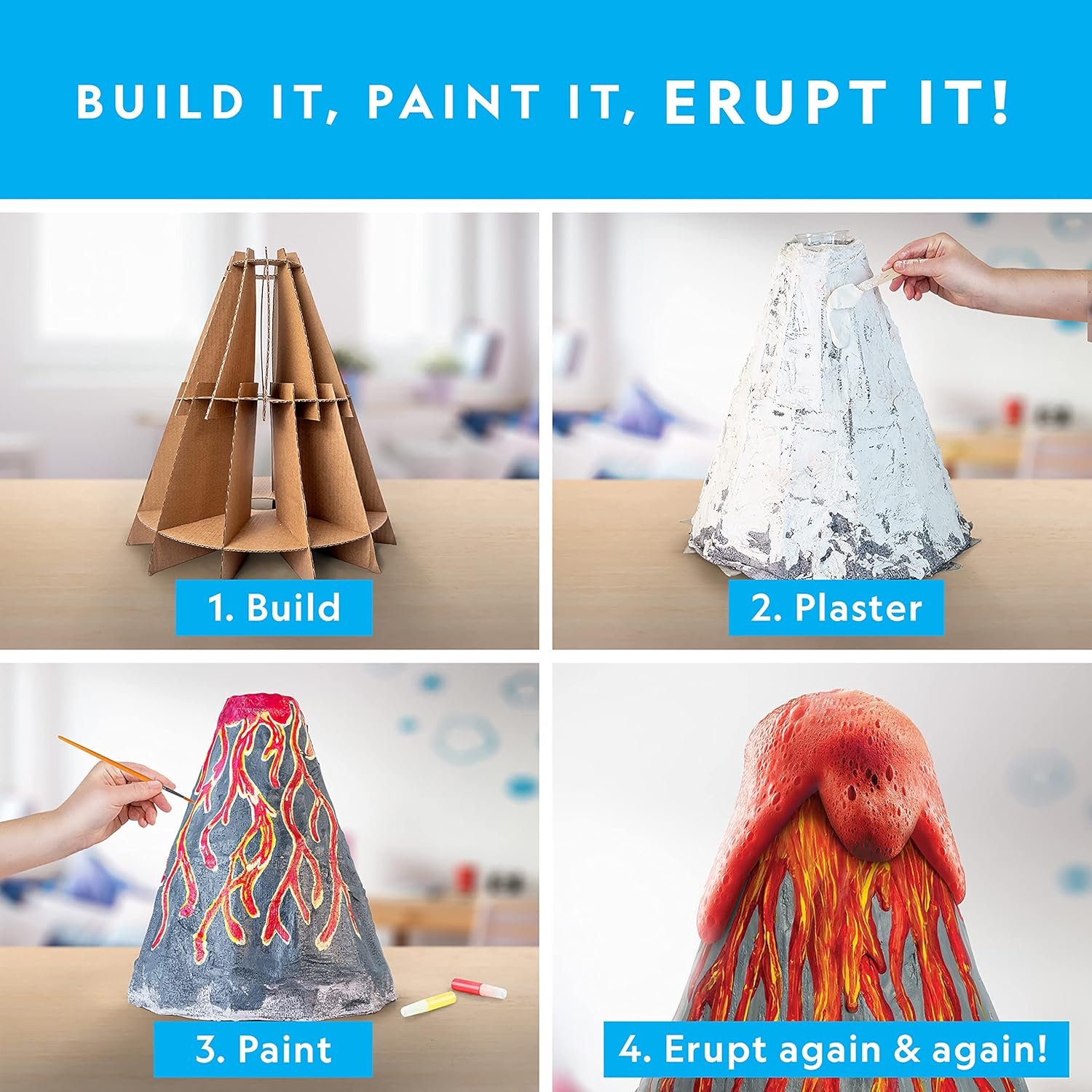 EASY SETUP – Kid-friendly instructions make this jumbo volcano easy to make and erupt. Layer the plaster wrap over the frame, add plaster, and once it’s dry, paint it and erupt it again and again!