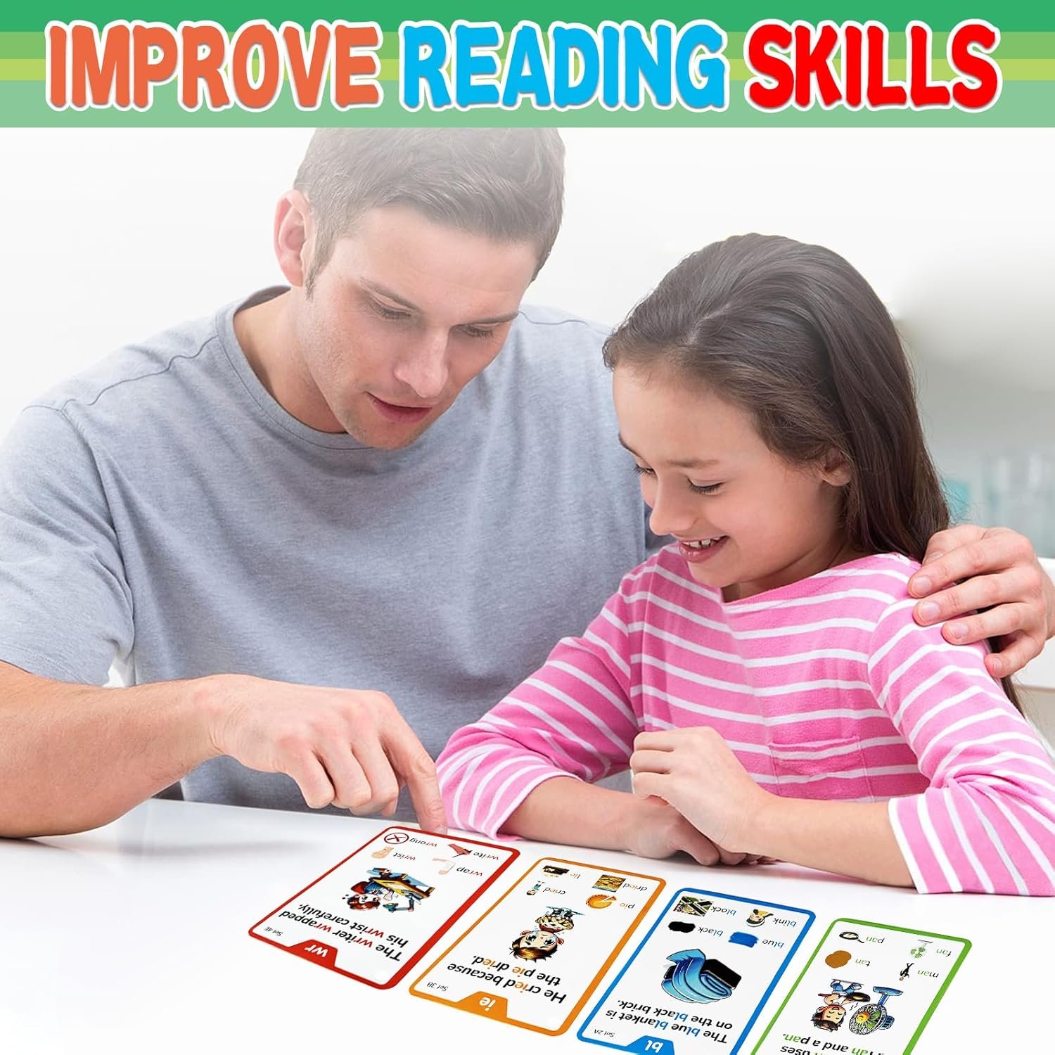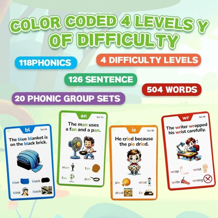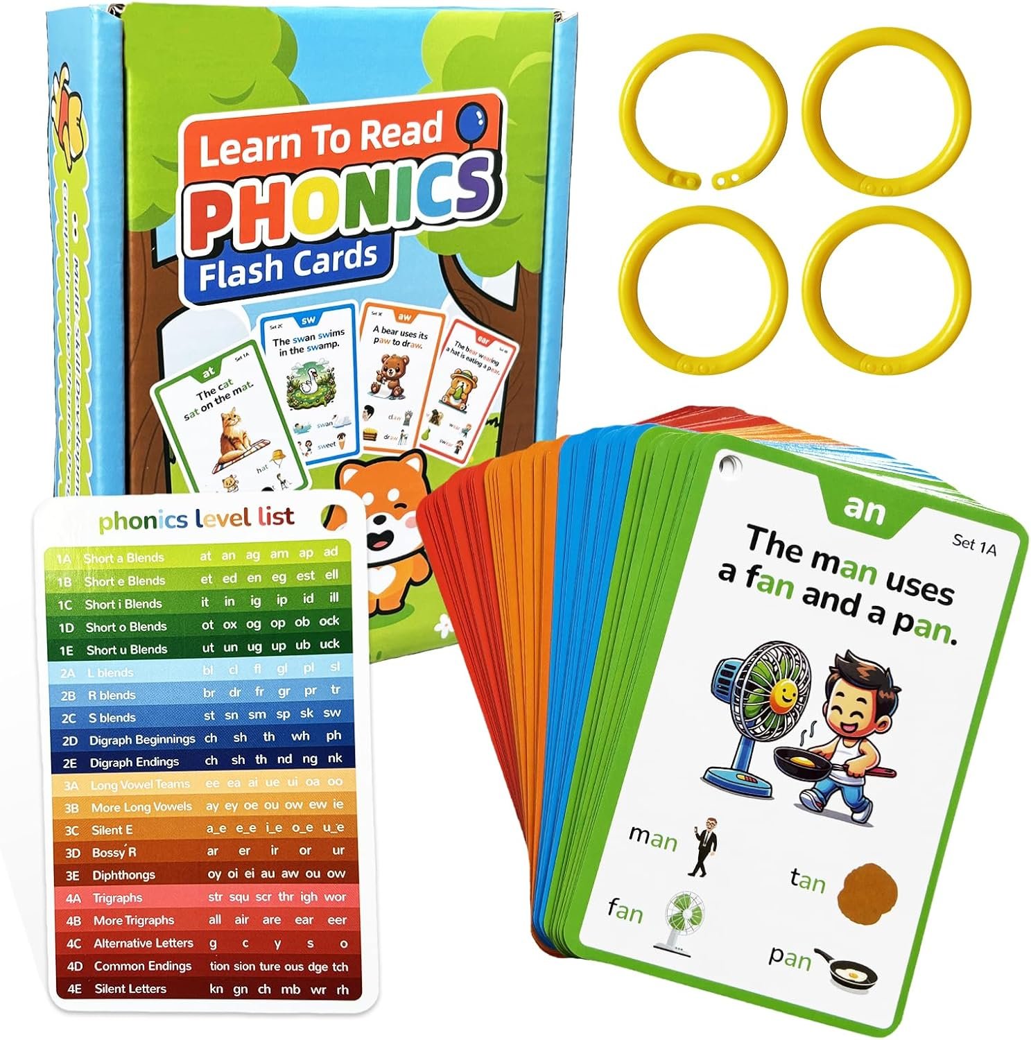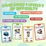 Master Their Phonics, Improve Reading Skills: Include 64 double-sided phonics flashcards; 4 sorting rings; 504 words, 630 Pictures; 126 sentences; 4 Difficulty levels 20 Phonic Group Sets (1A-4E)