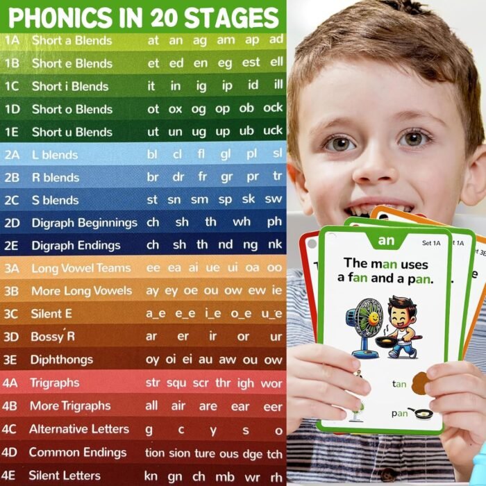 Phonics Flash Cards – Learn to Read in 20 Stages – Digraphs CVC Blends Long Vowel Sounds Phonics Sight Word Games for Kids Ages 3-8 Preschool Kindergarten 1st 2nd 3rd Homeschool Educational