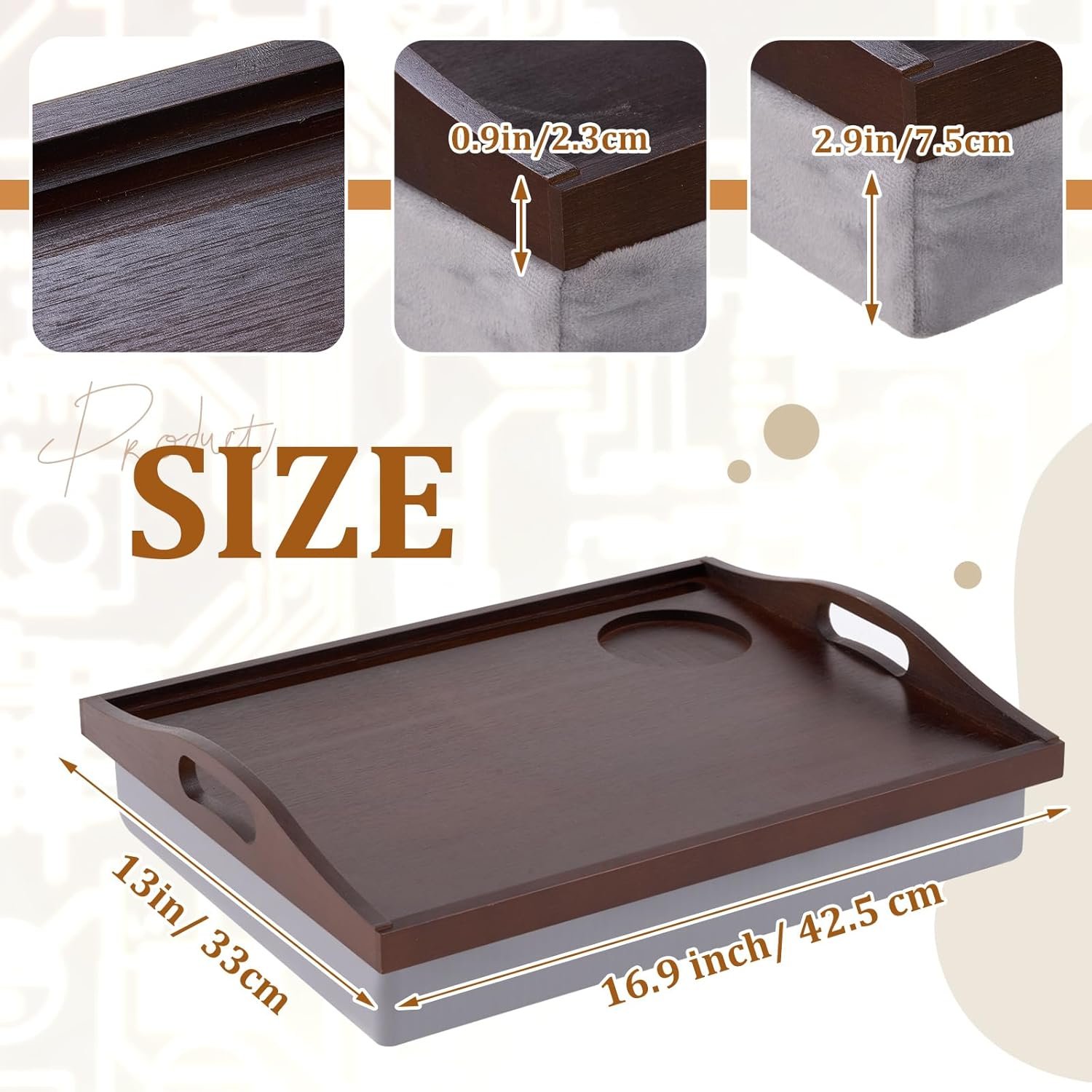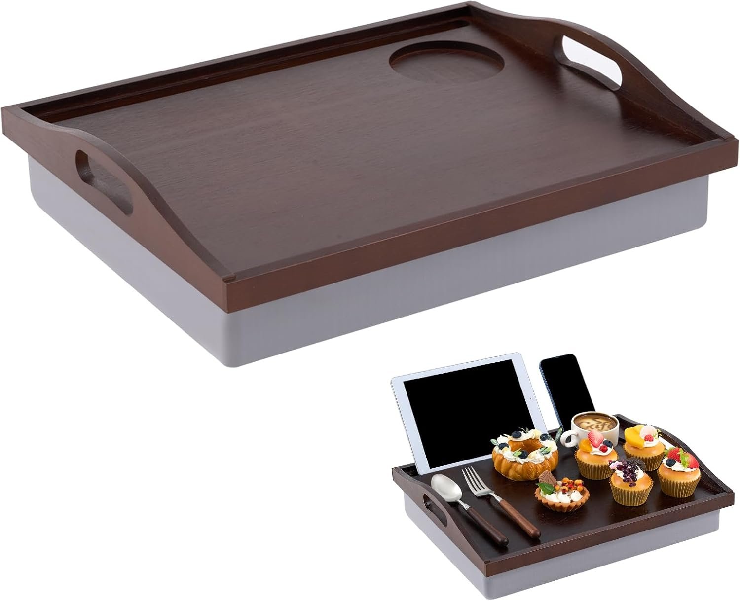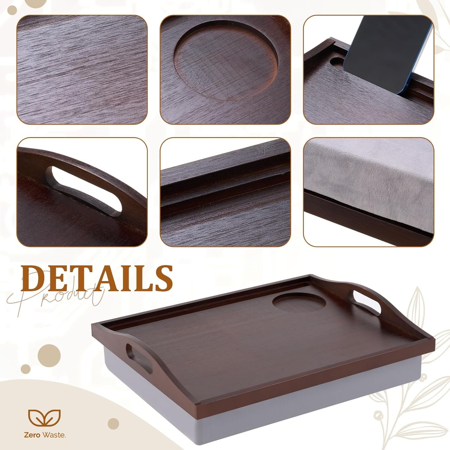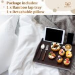 Reliable Quality: the bed trays for eating are made of quality bamboo, ensuring longevity and reliability, showcasing a natural color, as its sturdy material keeps without sacrificing aesthetics; On the other hand, the detachable pillow available in a tasteful gray shade, offers nice comfort with its generous foam padding