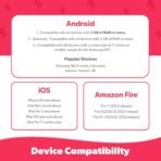 Device Compatibility: Compatible with iOS devices (iPad 5th gen & newer, iPad Pro, iPad Air, iPad Mini 2nd gen & newer, iPhone 6 & newer), select Samsung tablets (2015 and newer with 2GB RAM), and Amazon Fire devices (Fire 7 9th gen 2019, Fire 8 8th gen 2018, 10th gen 2020). Some models are not supported.