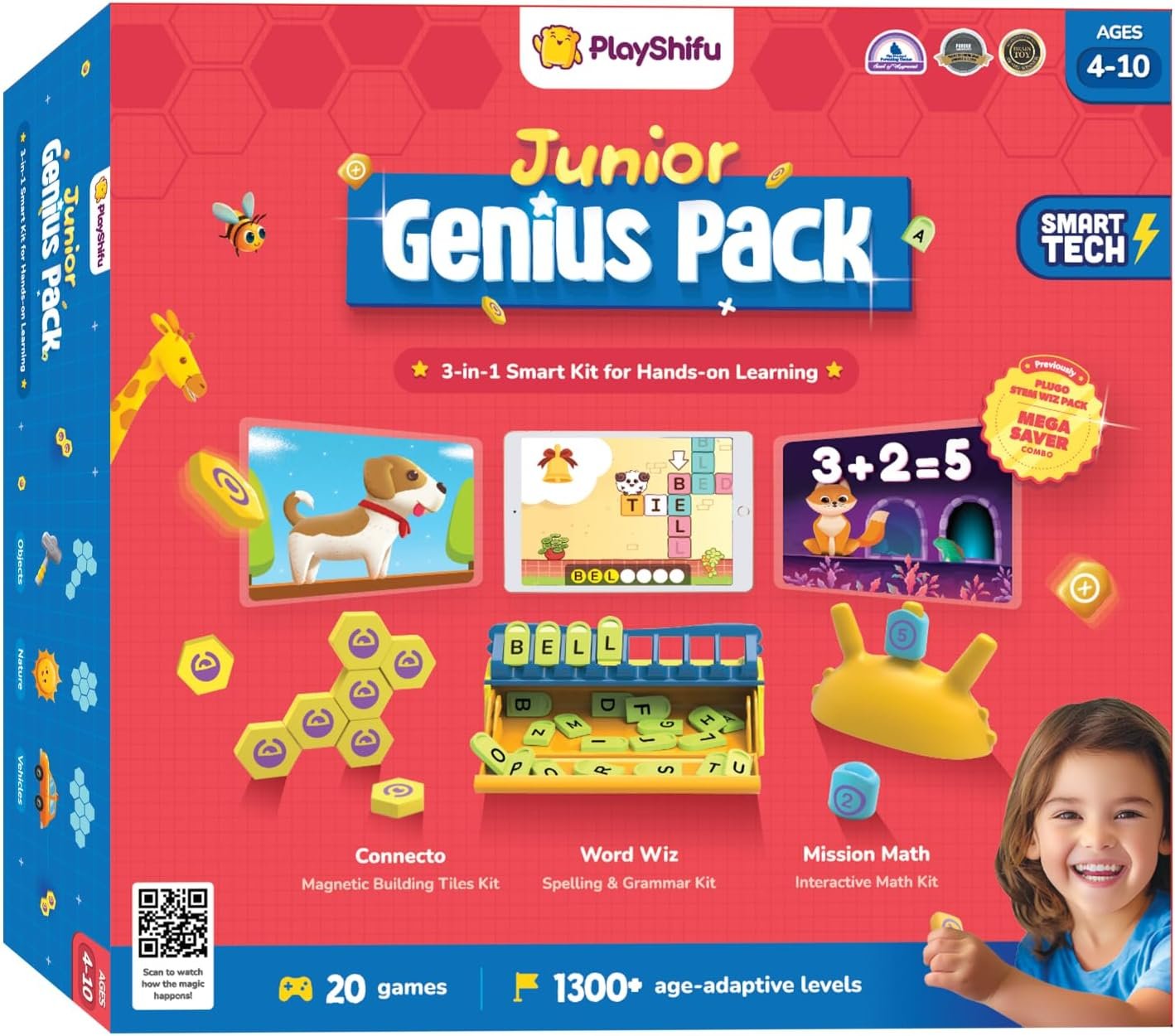 PlayShifu Junior Genius Pack | 3-in-1 STEM Learning Kit with Word Wiz, Mission Math & Connecto | Tech-Powered Educational Toys for Kids Ages 4–10 | Gift for Boys & Girls | Tablet Not Included