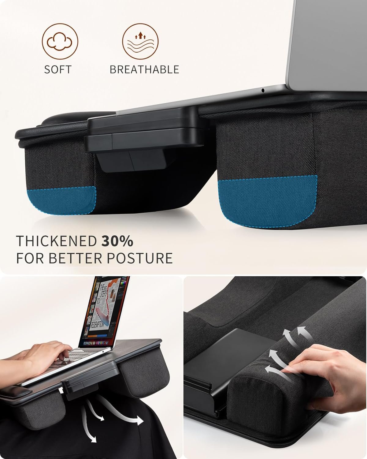 Thickened Lap Desk Cushions: SAIJI Laptop Lap Desk design with 30% soft thickened cushion on the bottom, allow for a better angle when using laptop, and creat a larger space for air flows and laptop heat dissipation.