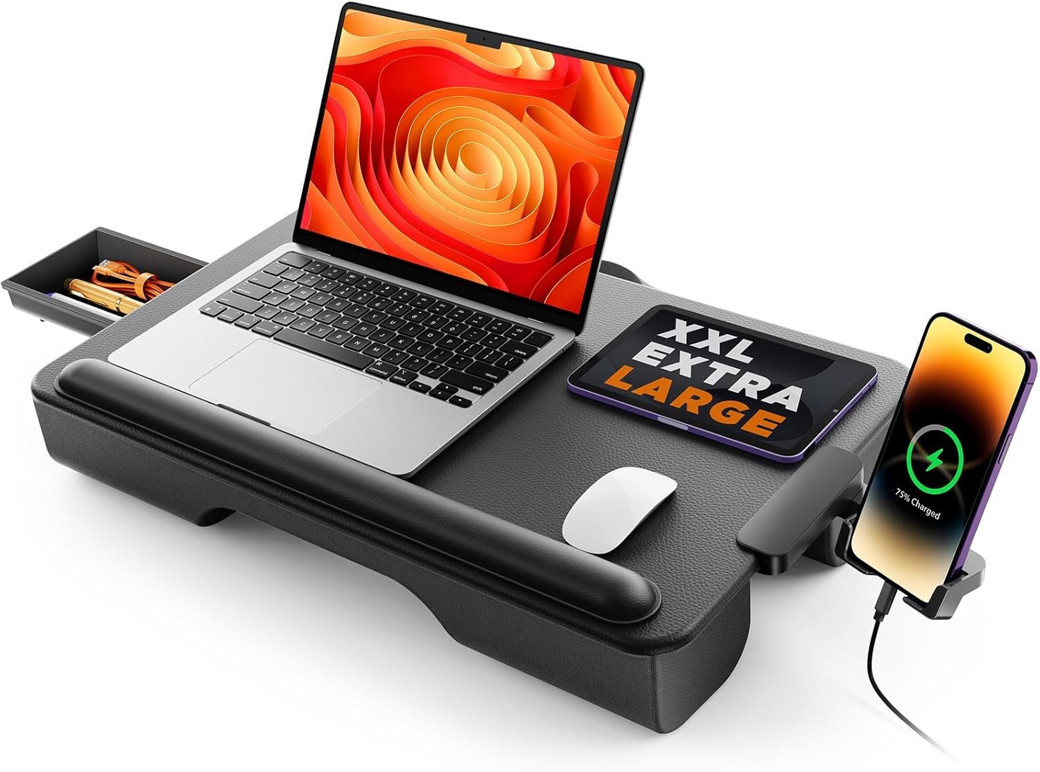 Customers find the lap desk comfortable with its textured faux leather surface and good cushioning, while also praising its build quality with high-quality materials and sturdy construction. Moreover, the desk functions well with a phone holder on the side, and customers appreciate its size, accommodating large gaming laptops perfectly. Additionally, they like its lightweight design and consider it good value for money.