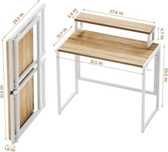 Small Folding Desk 31.5 Inch, Foldable Computer Desks with LED Lights and Monitor Stand, Work Portable Table for Bedroom Home Office, Oak