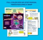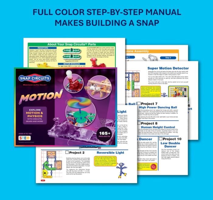 Snap Circuits Motion Over 50 parts and over 165 projects to complete. All motion and physics focused. Experiment with gears ratios using various gears and pulleys. Experiments include: Color changing lighted fan, Air “fountain”, Motion Detector and so much more Simple, Fun Projects Let Kids Learn While They Play With its easy-to-follow instructions, Snap Circuits gives your child a hands-on education in how electrical circuits work to run the everyday devices that they’re familiar with. They’ll also gain valuable lessons in building and in following instructions. The project manual includes large color illustrations and simple directions for each project.
