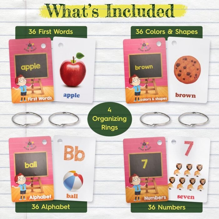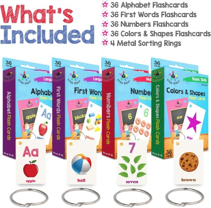 Star Right Words Toddler Flash Cards Set of 4 – Number Flash Cards, First Words, Colors and Shapes, & Alphabet/Letter Flashcards – 4 Binder Rings – 144 Sight Words Kindergarten Flash Cards 3-7 Years