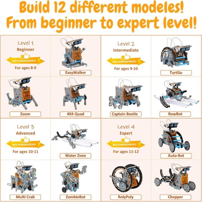 ✔️ [12 IN ONE]: Our science toys robots for kids 8-12, for your child to build 12 innovative solar toys that will spark their imagination; including an Auto-Bot, a Captain Beetle-Bot, a Surf-Bot, Chopper, RolyPoly, ZombieBot and so much more